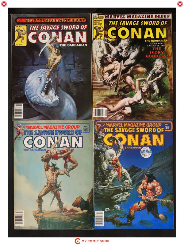 Issues 54, 55, 56, 57, 58, 59, 60, 61, 64, 66 of Savage Sword of Conan (1974 Marvel), Most will grade in the VG to FN range.