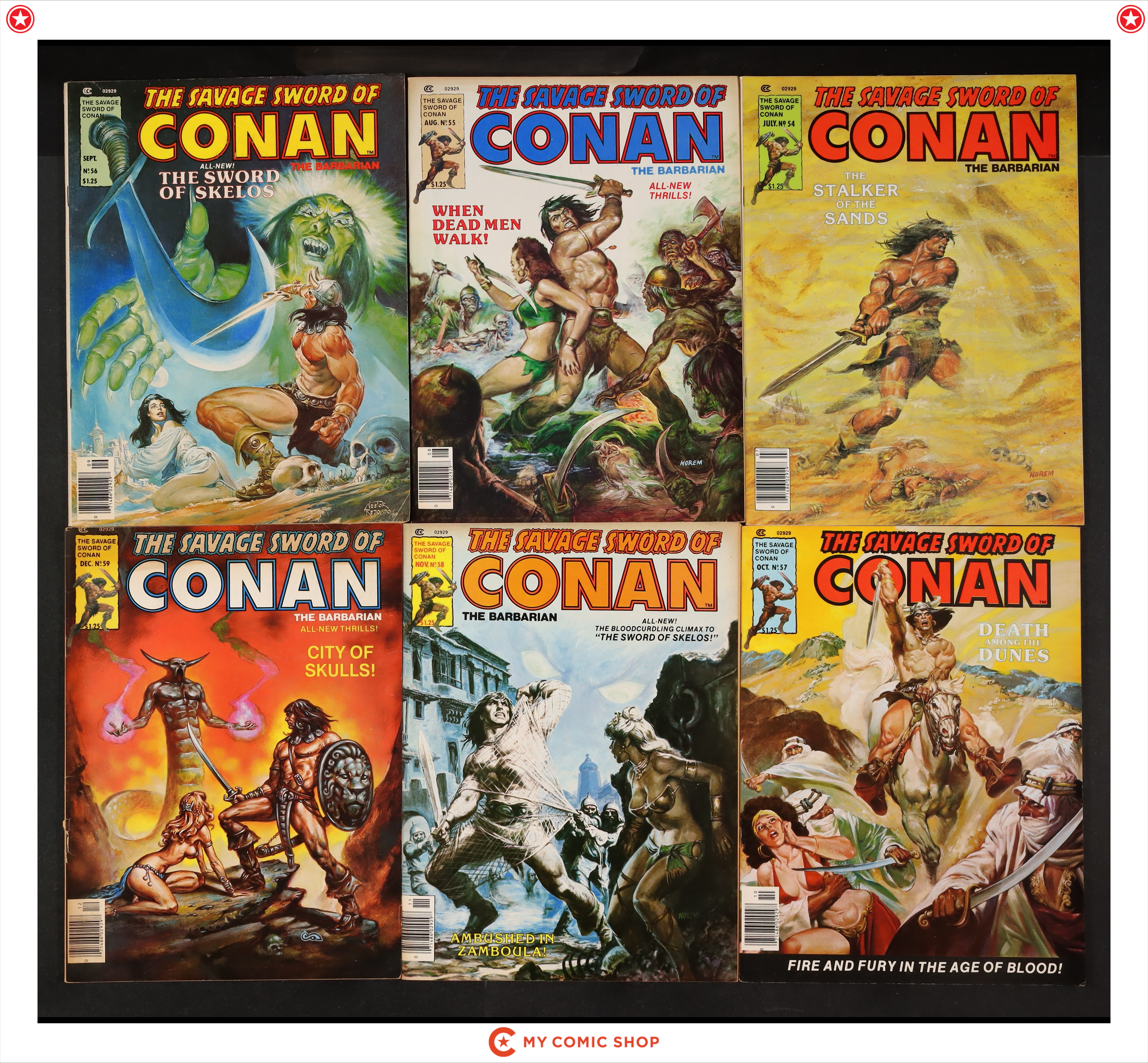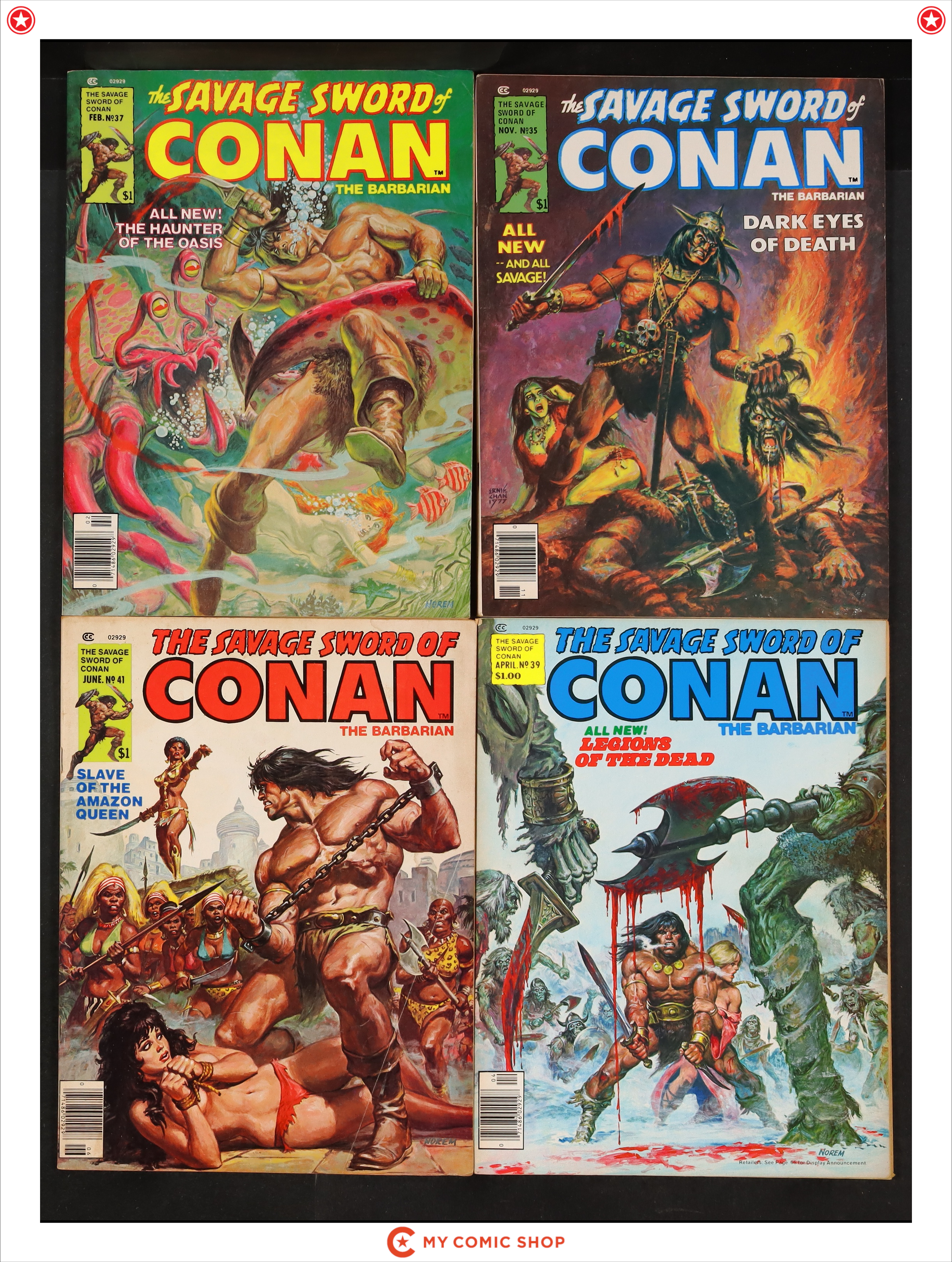 Issues 17, 30, 31, 32, 33, 34, 35, 37, 39, 41 of Savage Sword of Conan (1974 Marvel). Most will grade in the GD to VG/FN range, with #32 grading at FR.