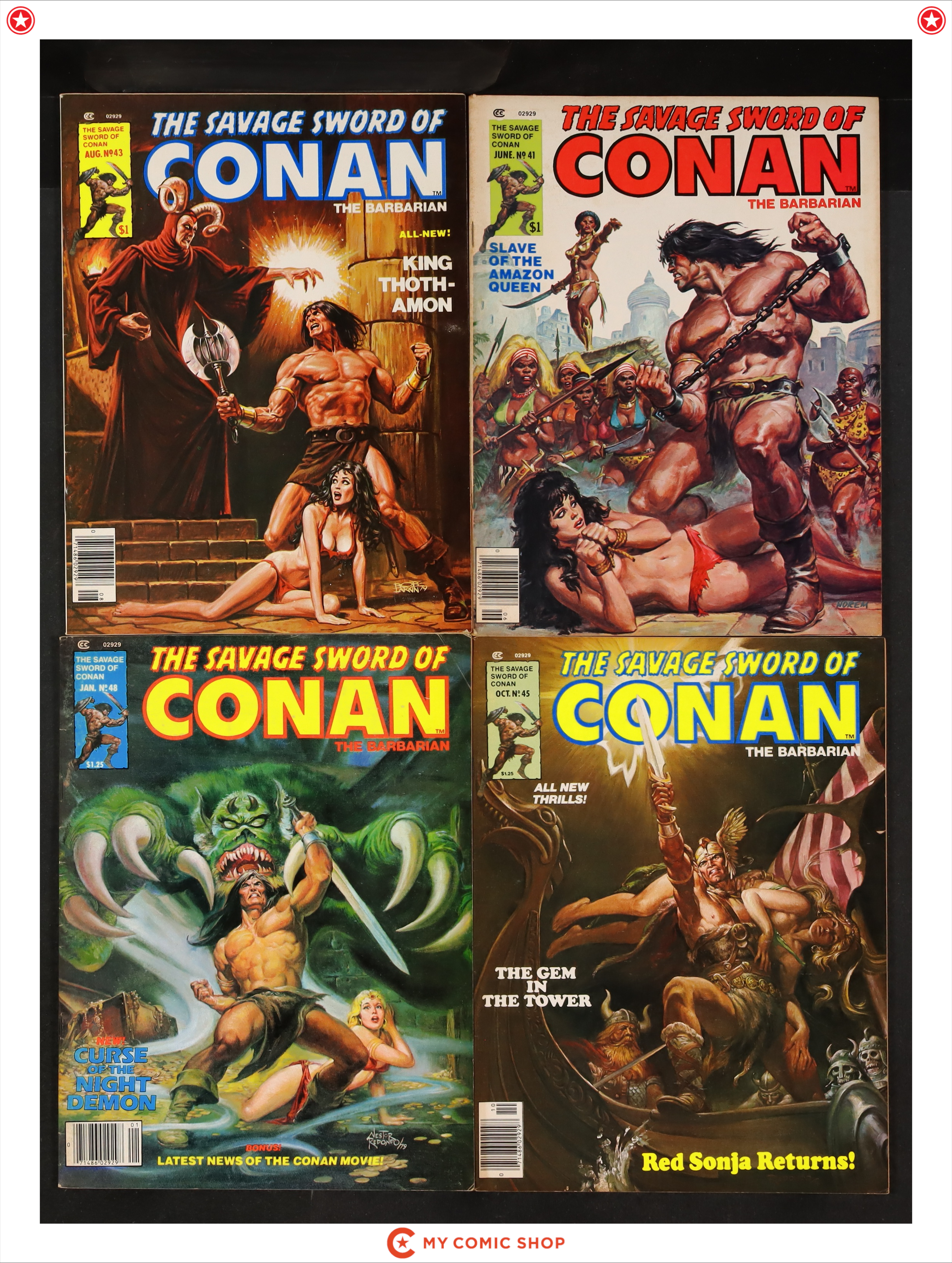 Issues 43, 44, 45, 46, 47, 48, 49, 51, 52, 53 of Savage Sword of Conan (1974 Marvel). Most will grade in the GD- to VG/FN range.