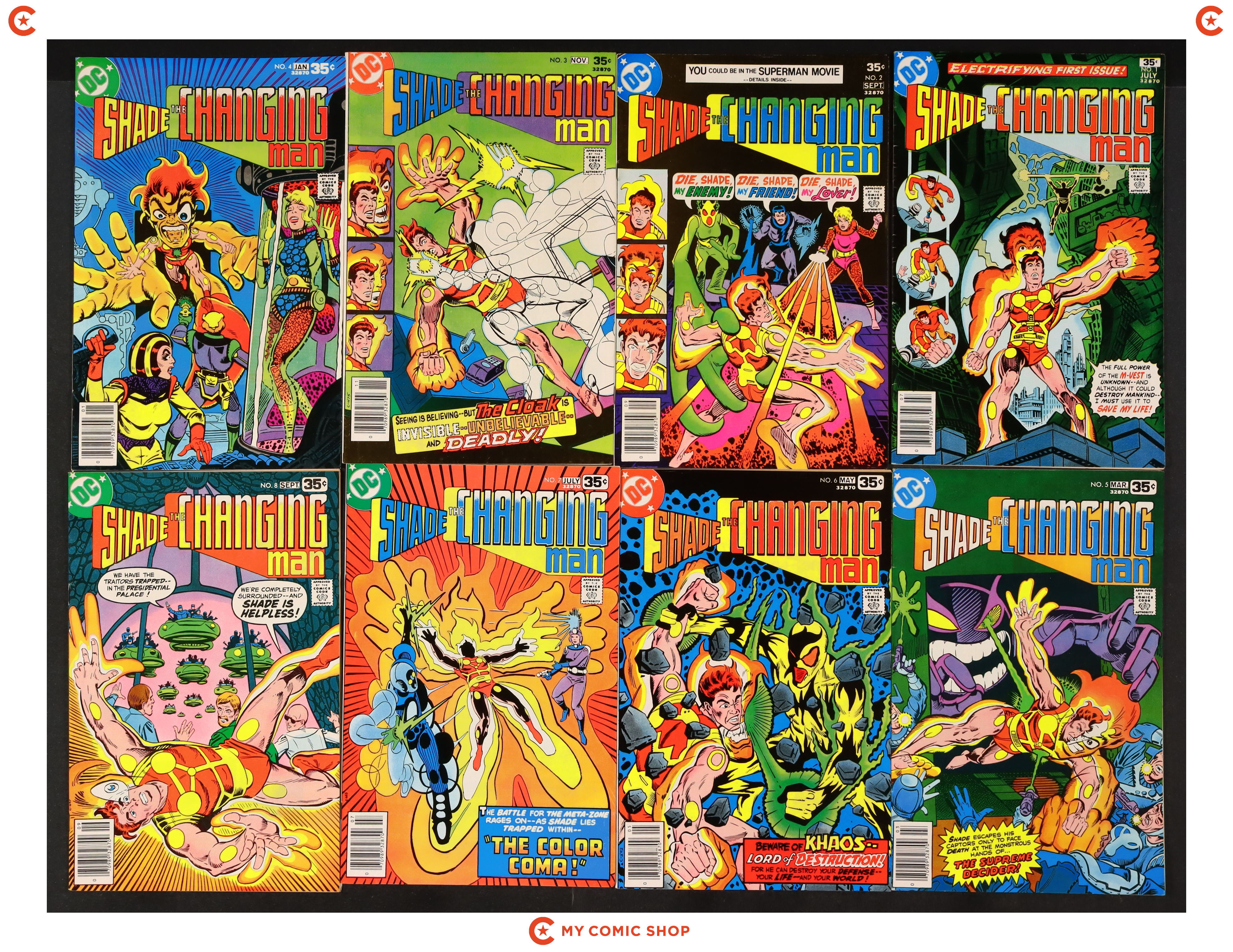 Issues 1-8 of Shade the Changing Man (1977 1st Series). Most will grade in the FN range with a couple grading VF.