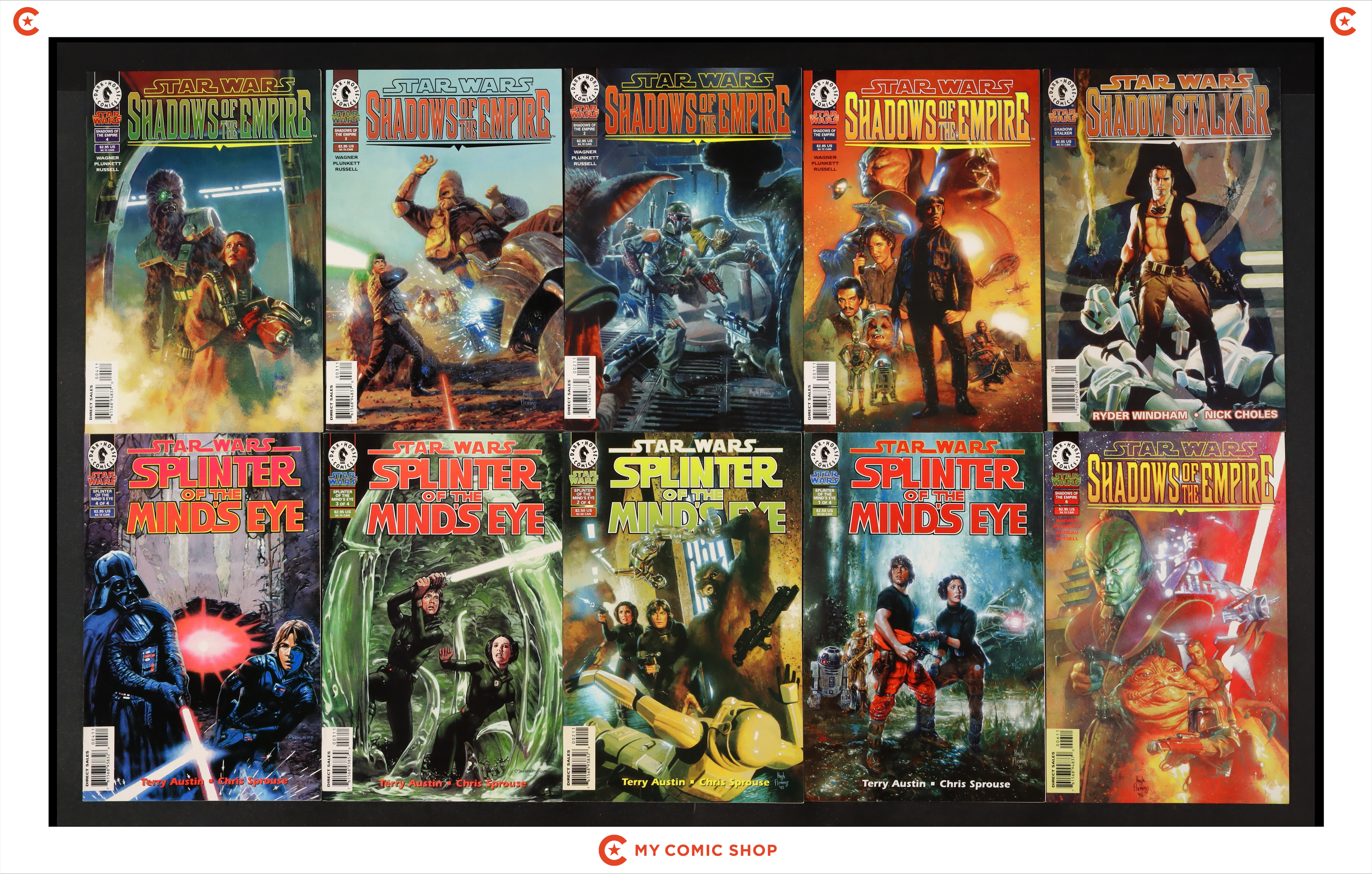 Issues 1 of Star Wars Shadow Stalker (1997); 1-4 and 6 of Star Wars Shadows of the Empire (1996); and 1-4 of Star Wars Splinter of the Mind's Eye (1995). Most will grade in the VF to FN+ range with #1 of Splinter of the Mind's Eye grading VG.