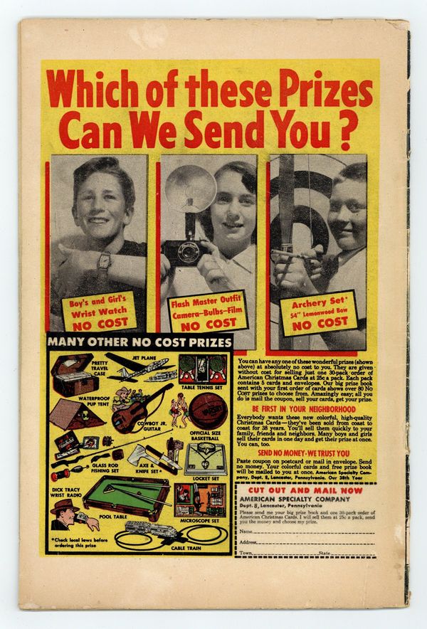 Starts Apr 20 Cover art by Joe Maneely. This Dark Cave, art by Bill Benulis; A man returns to his shelter after he mistakes a small town that has been evacuated in service of atomic bomb tests for the worldwide war that he has feared would come. The Search text story. A Stranger on Earth, art by Bill Everett; When an alien crash lands on Earth, he is met with violence. The Man Who Caught a Mermaid, art by John Forte. The End of Time!, art by John Forte; God intervenes directly to stop militarists from rushing towards war. No Place to Hide, pencils by Paul Reinman. 36 pgs. $0.10. Cover price $0.10.