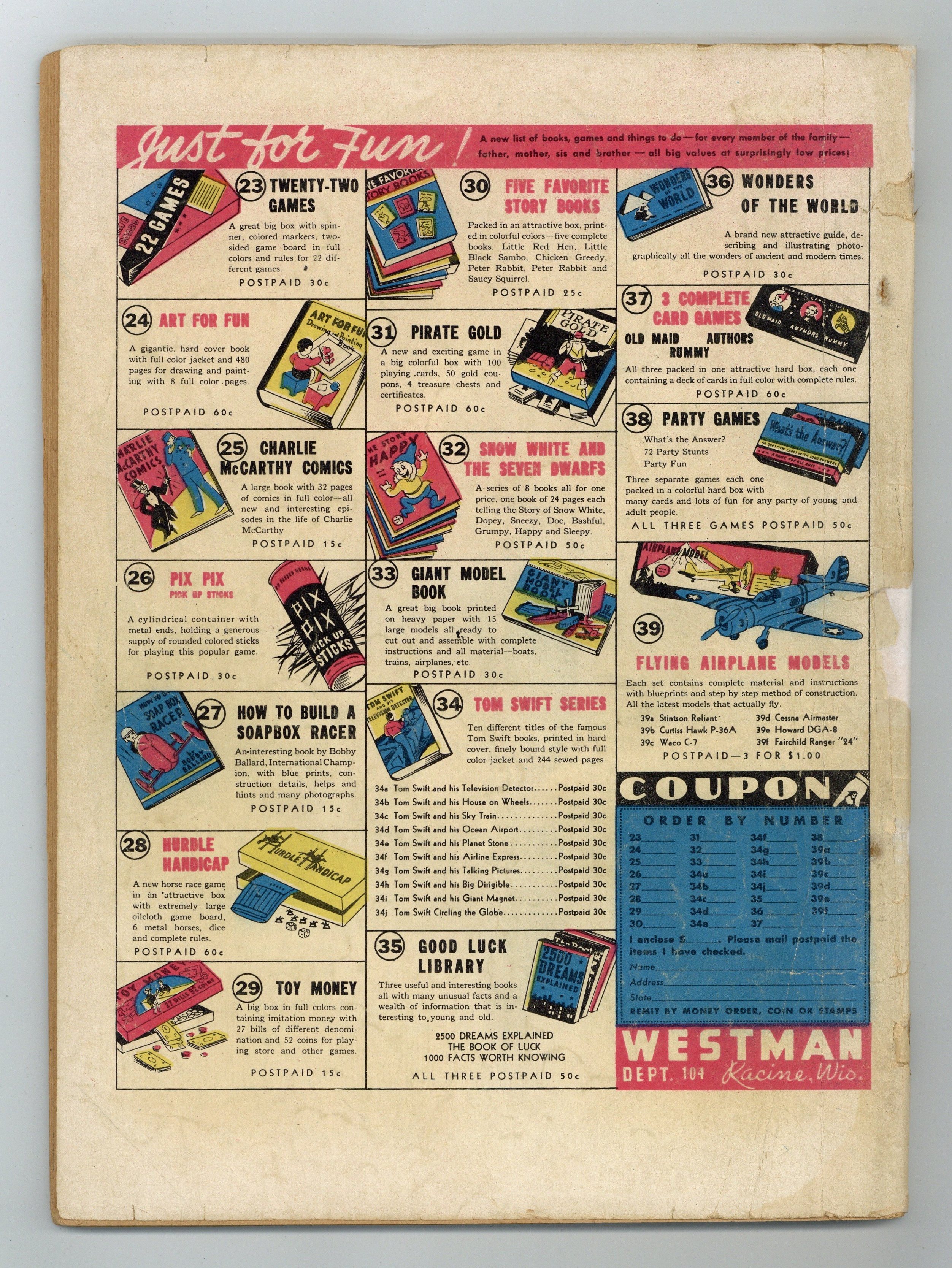 Starts Jul 4 Cover by Bill Holman. Stories and art by Milton Caniff, Chester Gould, Frank King, Harold Gray, Bill Holman, Zack Mosley, Stanley Link, Oskar Lebeck, Frank Willard, Gus Edson, Walter Berndt, Ed Leffingwell, Martin Branner, Basil Reynolds, Loy Byrnes, Al Posen and Carl Ed. An early comic book from Dell, featuring reprinted newspaper comic strips alongside new material. Pat, Terry and Connie head up the rescue mission to free Sandhurst from his captors, against their better judgment. Skeezix gets his first traffic ticket while driving Tops' car, and town gossip soon has it as a major moving violation. Smilin' Jack learns the secret of the Legion of Forgotten Pilots. Also featuring popular strips Little Orphan Annie, Dick Tracy, Smokey Stover and The Gumps. Foo-lish Folks; Moon Mullins; Dick Tracy; Tiny Tim; Smitty; Spooky; Gasoline Alley; Tim Todd the Boy Detective; The Crow's Nest; Wyoming Willie; Skit, Skat and the Captain; Winnie Winkle; The Gumps; Harold Teen; Little Orphan Annie; Manuk the Arctic Crusoe; Bobby & Chip; Zipper; Do You Know?; Terry and the Pirates; Streaky; Elmer; Sweeney & Son; Smokey Stover; Little Joe; Smilin' Jack. 64 pages, Full Color. Cover price $0.10.