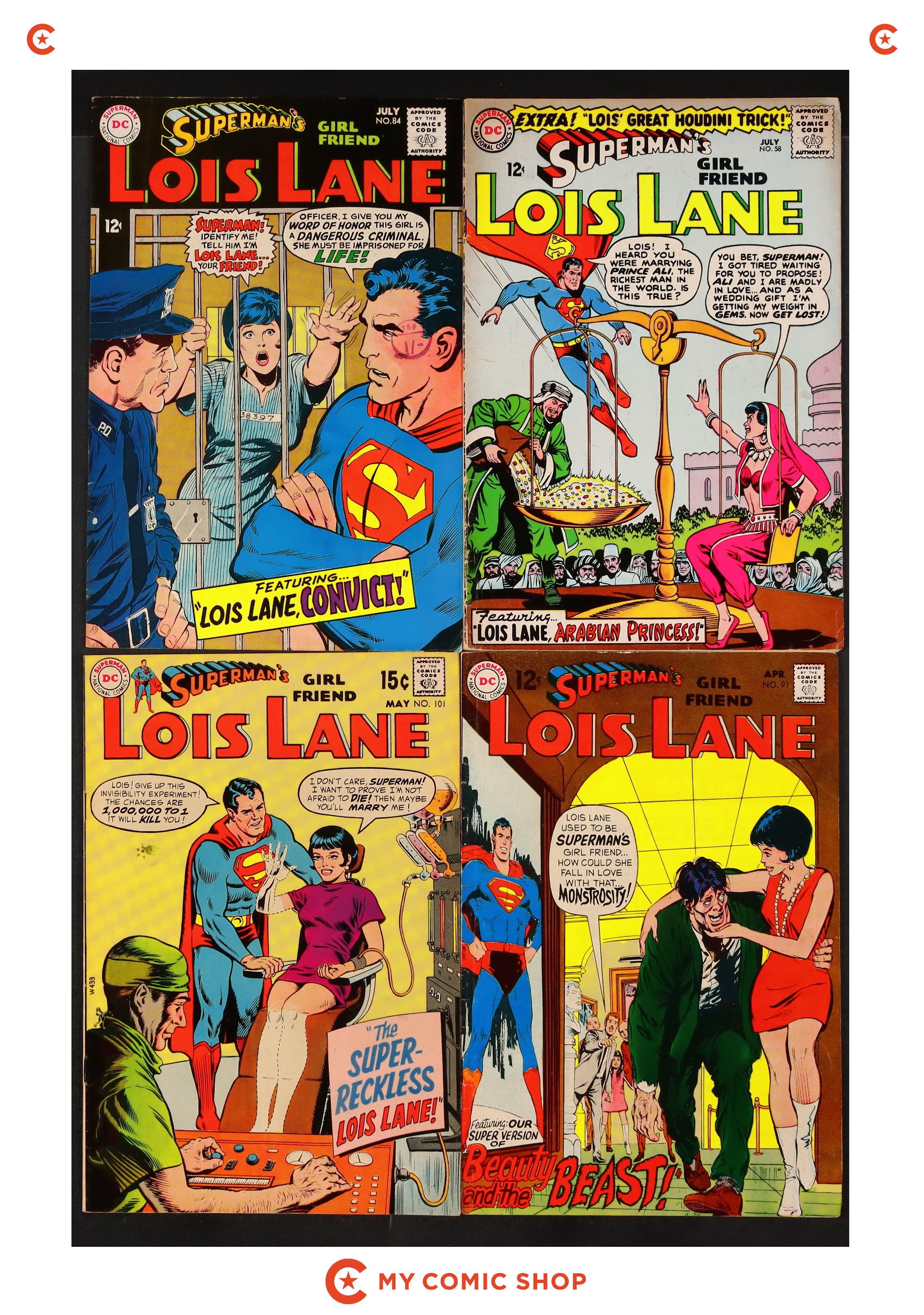 Issues 58, 84, 91, and 101 of Superman's Girlfriend Lois Lane (1958). Most will grade in the VG to FN range.
