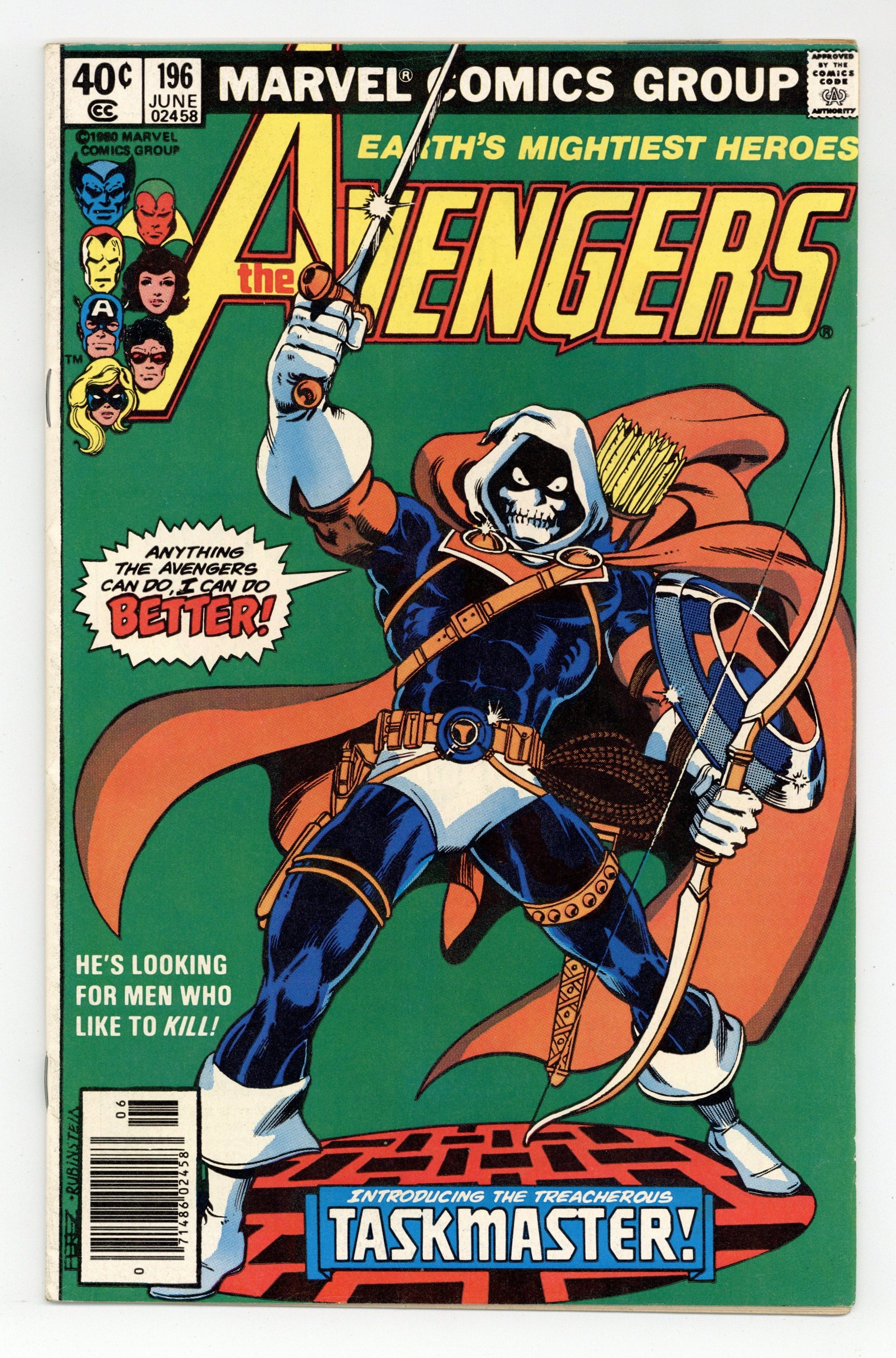 Starts Jan 19 Newsstand Edition. "The Terrible Toll of the Taskmaster" Guest-starring Ant-Man. Script by David Michelinie. Pencils by George Perez. Inks by Jack Abel. Cover by George Perez and Joe Rubinstein. A brand new villain, the Taskmaster, has turned the tables on the Wasp, Yellowjacket, and Ant-Man! The three insect-like super-heroes are prisoners inside the Taskmaster's training academy! The good news is that seven avengers are waiting outside the training compound, but the bad news...none of them know that their teammates are in grave danger! However, Earth Mightiest Heroes follow the ants, and the trail leads to the Taskmaster! Is the villain with the photographic reflexes ready to battle the Avengers? Choose wisely dear Taskmaster! First (full) appearance and origin of the Taskmaster. (Notes: The Taskmaster appears next in Marvel Team-Up 103. The letters page includes a letter from comics writer Kurt Busiek.) 36 pages Cover price $0.40.
