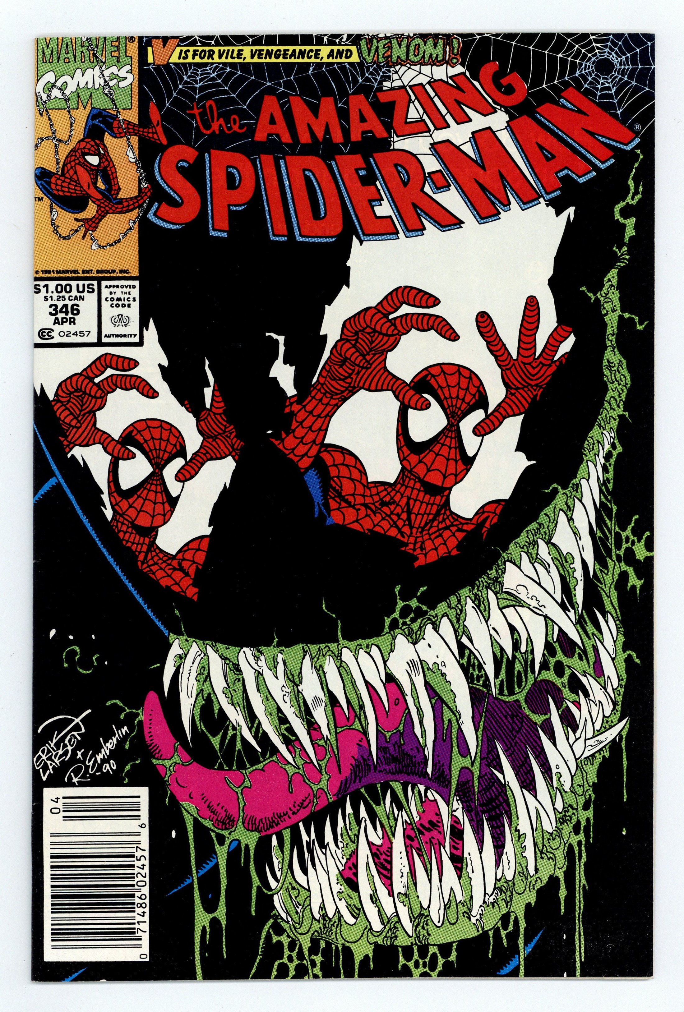 Starts Apr 27 Direct Edition. Cover pencils by Erik Larsen, inks by Randy Emberlin. "Elliptical Pursuit!", script by David Michelinie, pencils by Erik Larsen, inks by Randy Emberlin; Eddie Brock is back…for Peters head!; After escaping prison, Venom taunts Spider-Man into a final showdown; Peter Parkers known for his smarts--why then does he stumble straight into Venoms trap?; An all-out smack down slugfest ensues. 36 pgs., full color. Cover price $1.00.