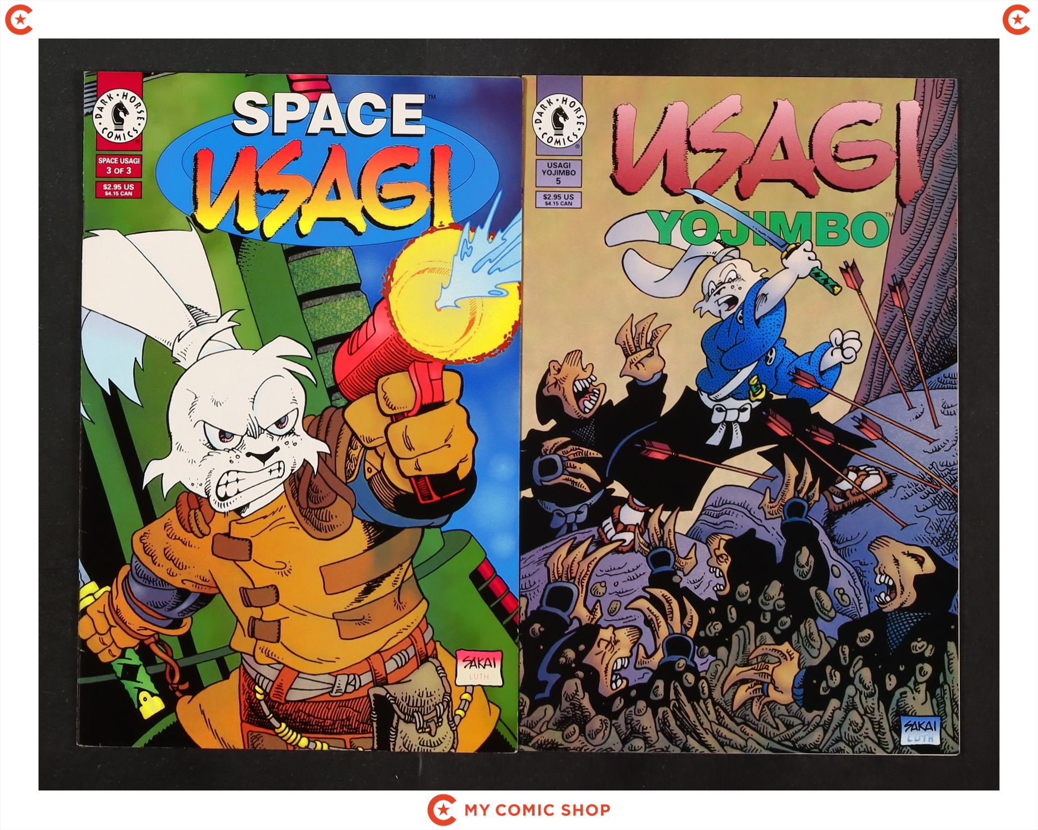Issues 5 of Usagi Yojimbo (1996 3rd Series Dark Horse); and 3 of Space Usagi (1996 Dark Horse). Most will grade in the FN+ range.