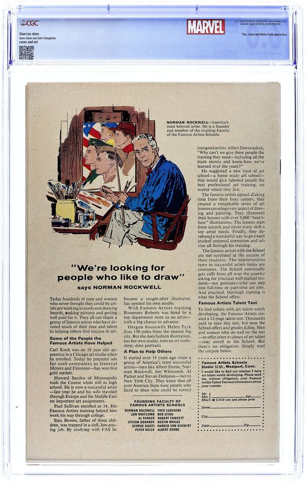 Ends Dec 22 8:00 PM CST Bid History 4 bids Current Bid $69 Your Secret Max Bid If you'd like to bid, please log in or register. Cover art by Wally Wood. First appearance of Mr. Fear in "Trapped by the Fellowship of Fear!" Script by Stan Lee, art by Wally Wood. The Fellowship of Fear includes Mr. Fear, the Ox, and the Eel. Cameos (Mr. Fear's sculptures) by Captain America, Electro, the Owl, Rama-Tut, Mysterio, Spider-Man, the Chameleon, Dr. Doom, the Hatemonger, Diablo, the Beetle, Kraven, Baron Zemo, Iron Man, the Toad, Mr. Doll, the Black Knight, Egghead, the Hulk, the Melter, Cyclops, the Vulture, the Thing (of the Fantastic Four), Dr. Octopus, Dr. Strange, Loki, Thor, the Super Skrull, the Cobra, Magneto, Giant Man, and the Green Goblin!; DD intrudes on a phony movie shoot where the Fellowship of Fear is robbing a bank and gets himself blasted by fear gas; Mr. Fear decides to flush DD out by creating a wax figure of Hornhead for his museum; DD and Foggy both get in a brawl with the Fellowship, and Foggy is injured; DD returns to the wax museum to put an end to the Fellowship. 36 pgs. Cover price $0.12. Cover price $0.12.