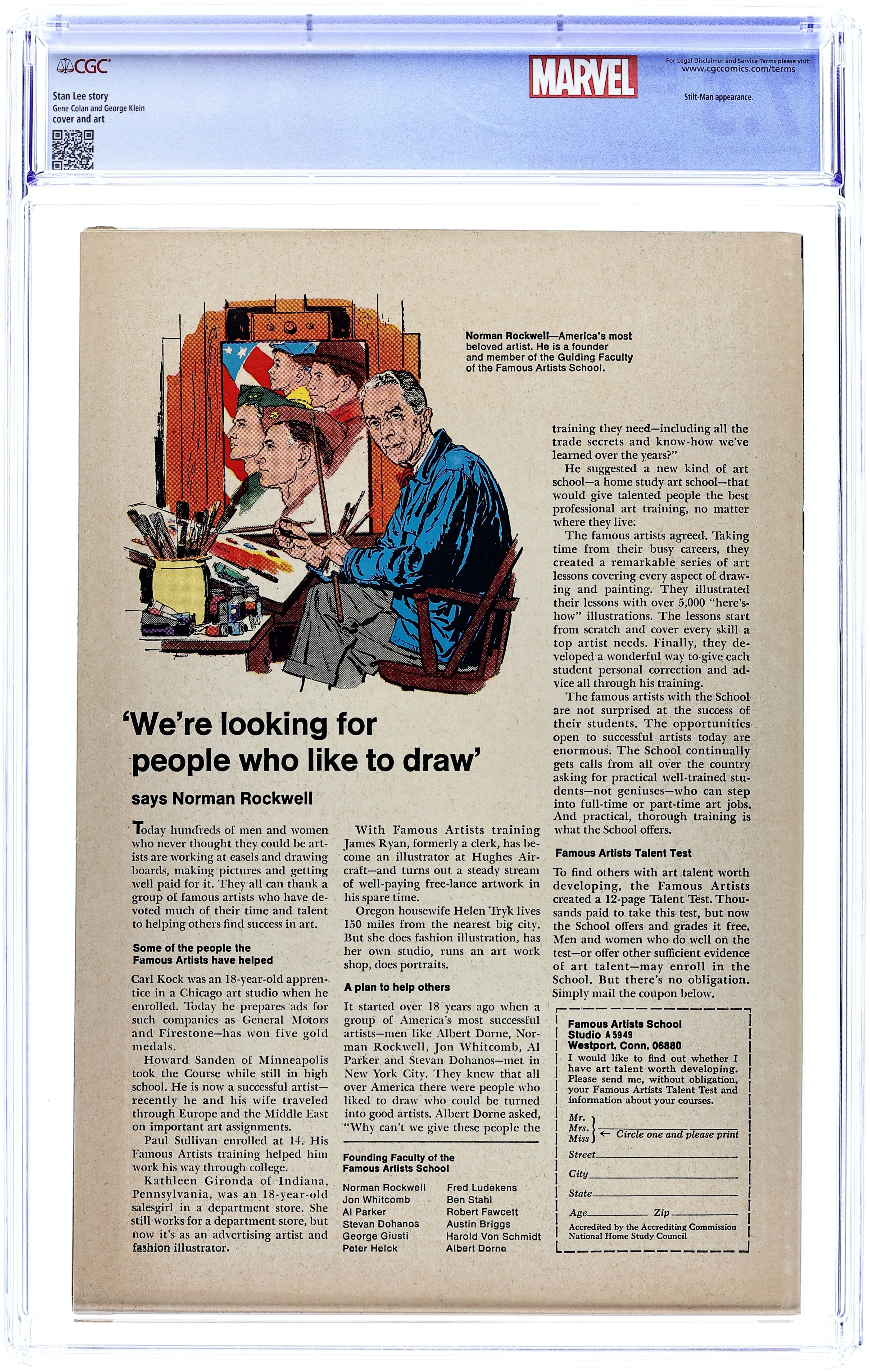 Ends Dec 22 8:00 PM CST Bid History 10 bids Current Bid $93 Your Secret Max Bid If you'd like to bid, please log in or register. Cover art by Wally Wood. First appearance of the Stilt-Man in The Stilt-Man Cometh!, script by Stan Lee, art and cover by Wally Wood; Nelson and Murdock are hired by a disgruntled scientist who claims his boss stole his invention; The scientist turns out, not only to be the real thief, but also the new villain, Stilt-Man. House ad for Fantastic Four #40 and Amazing Spider-Man #26. Letter by artist Alan Hutchinson. 36 pgs. Cover price $0.12. Cover price $0.12.