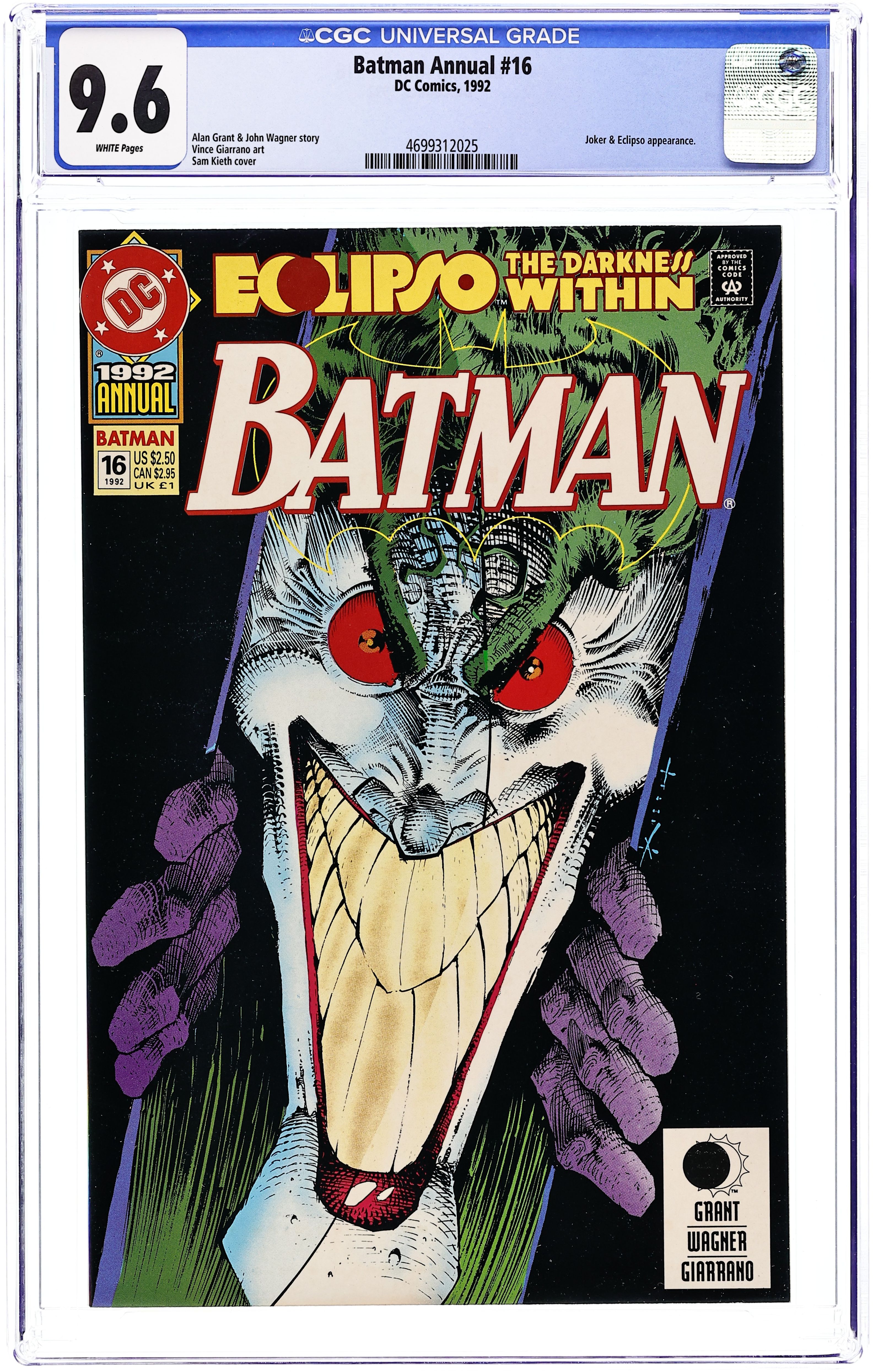 Starts Jun 15 ECLIPSO: THE DARKNESS WITHIN Annuals Crossover Event continues. When the Joker falls into possession of a black diamond and becomes 'eclipsed,' Batman is forced to become an Eclipso himself in order to confront his nemesis. Written by Alan Grant and John Wagner, with art by Vince Giarrano. Cover by Sam Kieth. Cover price $2.50.
