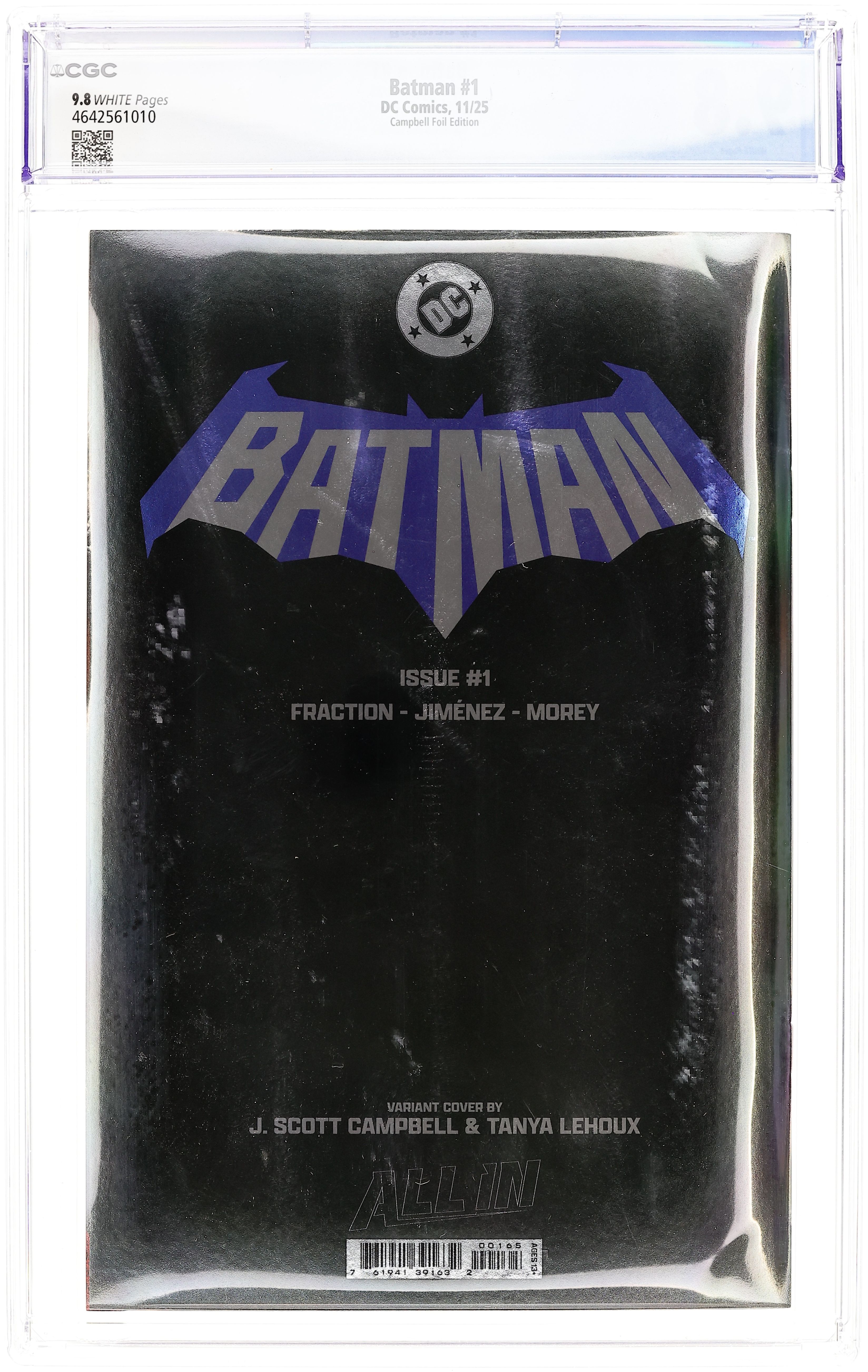 Starts May 25 Blind bag foil variant. Written by Matt Fraction. Art by Jorge Jimenez. Cover by J. Scott Campbell. A BOLD NEW ERA OF BATMAN STARTS HERE! A new day dawns for the Dark Knight Detective as Eisner Award-winning writer Matt Fraction (Hawkeye, Superman's Pal Jimmy Olsen) joins forces with superstar artist Jorge Jimenez (Batman, Summer of Superman Special) for an unforgettable new era of Batman! The best superhero in comics gets a brand-new first issue to kick off this new era that will test Batman and Bruce Wayne like never before! 40 pages, full color. Rated T+ Cover price $5.99.