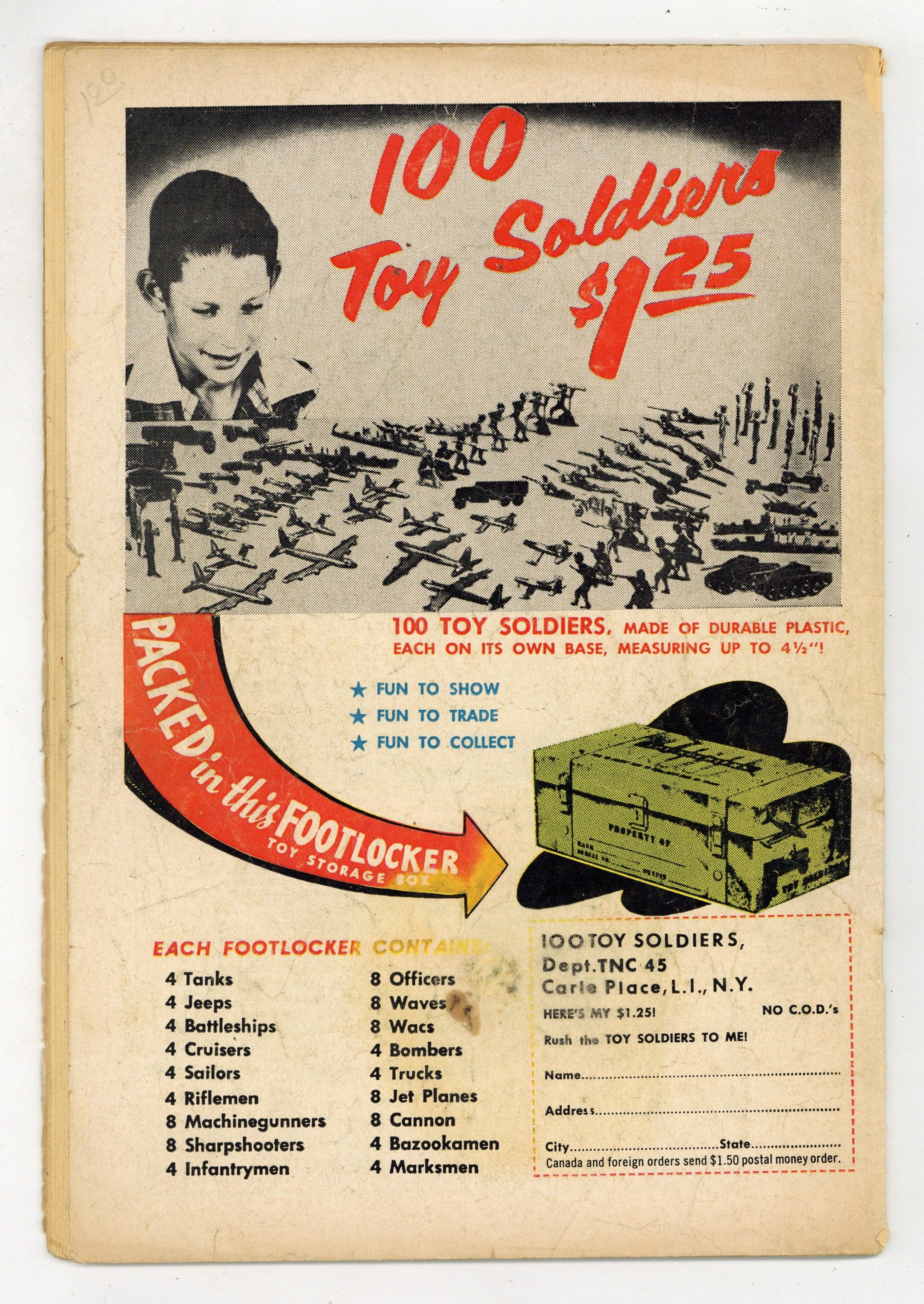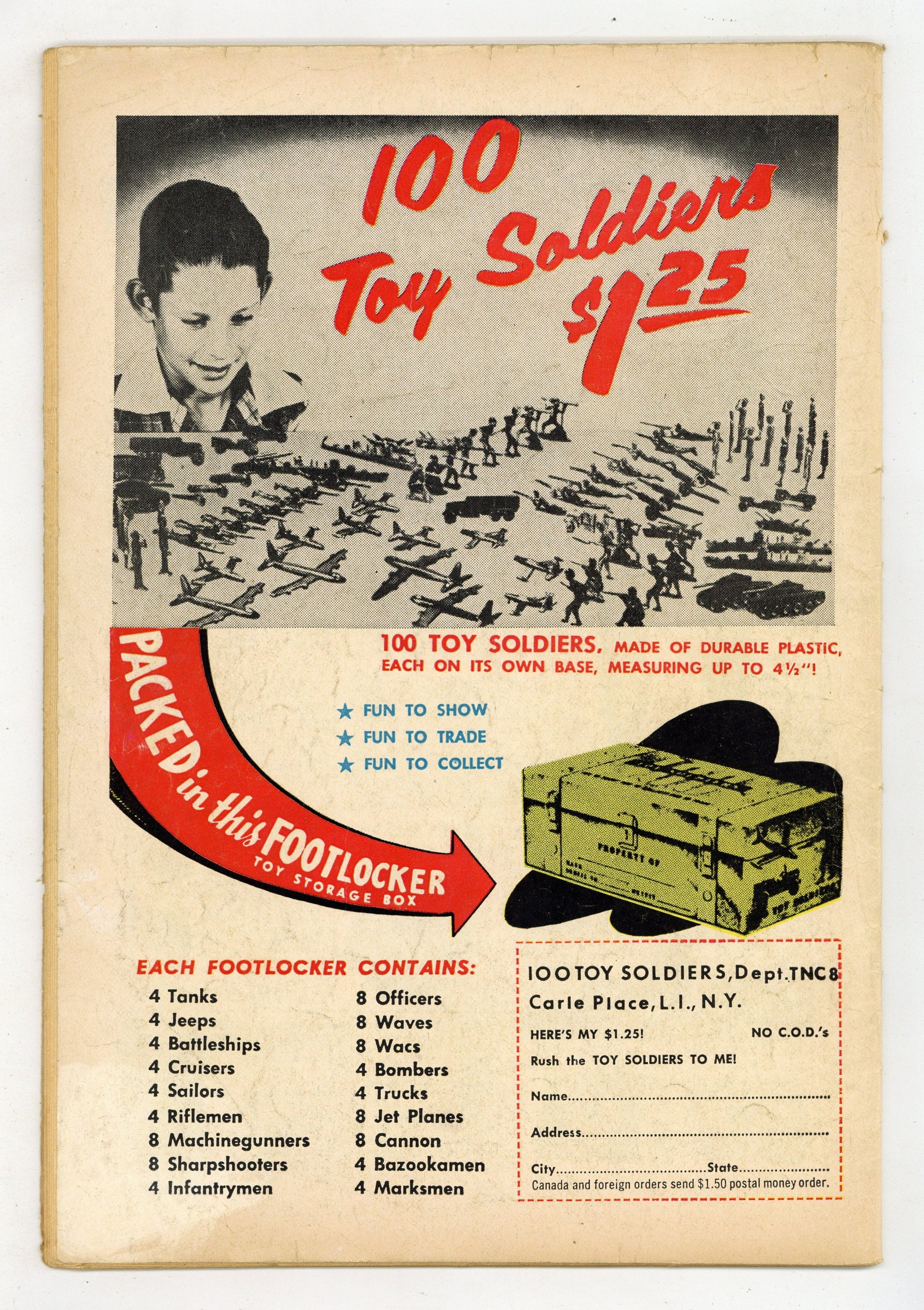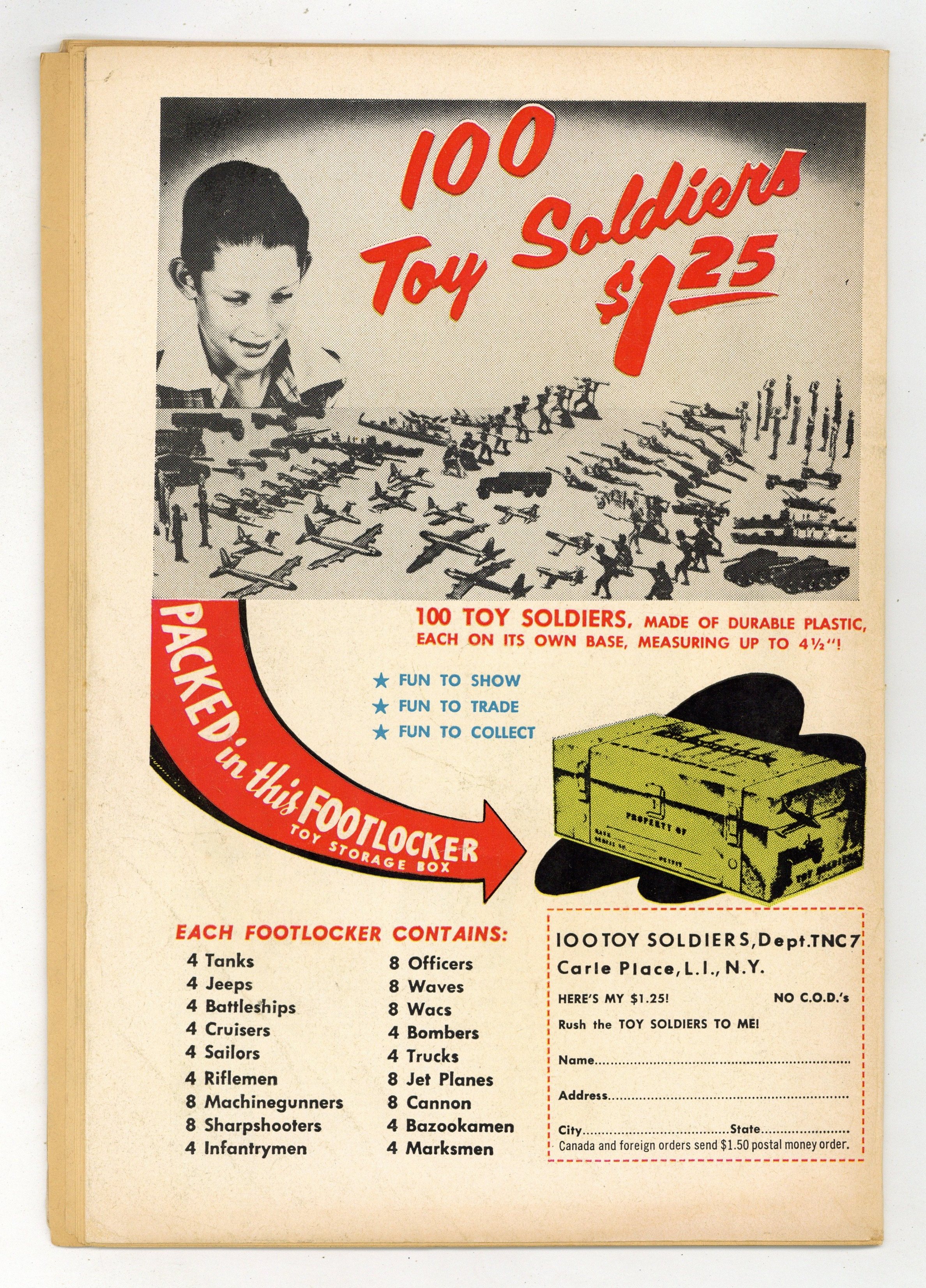 Starts Jan 3 Cover by Win Mortimer. "The Guardian of 100 Cities!", script by Bill Finger, pencils by Sheldon Moldoff, inks by Charles Paris; Famed replica artifacts from various movie sets, located in a field not far from Hollywood, serve as the stage as a hideout for escaped convict Shag Darnell and his thugs. Half-page Jerry the Jitterbug story by Henry Boltinoff. What Are You Getting Out of School? public service announcement with Buzzy by Jack Schiff, art by Win Mortimer. "The Bat-Train," pencils by Sheldon Moldoff, inks by Charles Paris; Batman takes a mobile Bat-Cave on the road by special train, but is mystified why a gang of crooks seeks to steal one particular trophy of his: a spool of recording wire. 2/3-page Casey the Cop story by Henry Boltinoff. One-page Casey the Cop story by Henry Boltinoff. Suspects Wanted article by Jack Miller, art by Raymond Perry. "The Ballad of Batman," script by Edmond Hamilton, pencils by Dick Sprang, inks by Charles Paris; A balladeer comes to Gotham City to sing the praises of Batman in verse, but it backfires when his songs tip off crooks wanting to commit crimes. 36 Pages, Full Color. Cover price $0.10.