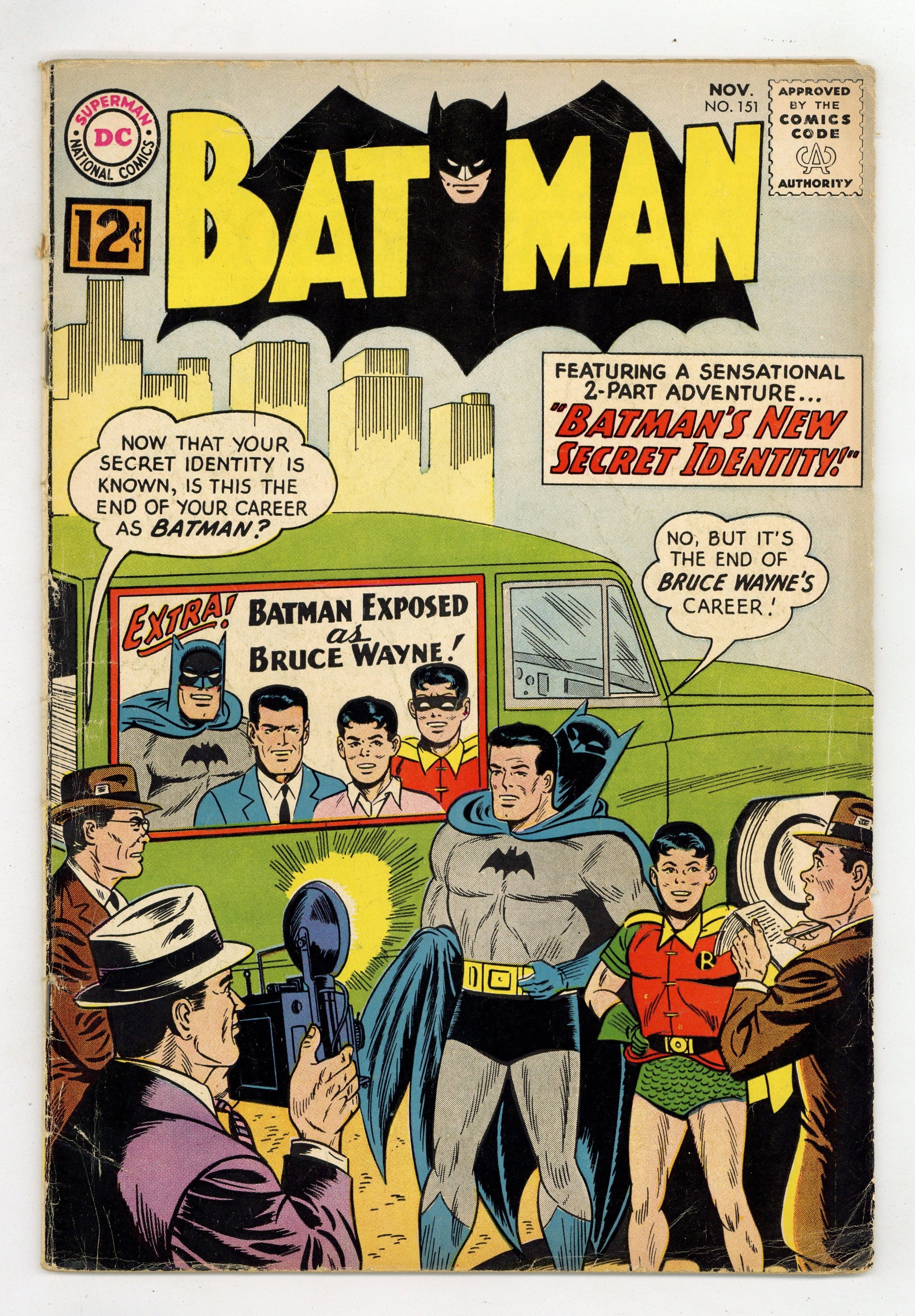Starts Dec 22 Cover pencils by Carmine Infantino, inks by Joe Giella. "Secret Identities for Sale!", script by John Broome, pencils by Sheldon Moldoff, inks by Joe Giella; While the Caped Crusaders are raiding the hideout of Mr. Incognito, a photographer takes pictures of the action with a special x-ray film, revealing the criminal's identity; The man offers to provide the identity to the Police for a million dollars while also offering the secret identities of the Dynamic Duo to the underworld for a price. "Walk, Batman--To Your Doom!", script by John Broome, pencils by Sheldon Moldoff (as Bob Kane), inks by Sid Greene; Batman is asked to investigate when four air-tight cases are blown when the juries involved return "not guilty" verdicts; Batman soon discovers that one juror, Franklin Knott, has been on all four juries in disguise. Rocky and Bullwinkle star in a one-page Cheerios ad. 36 Pages, Full Color. Cover price $0.12.