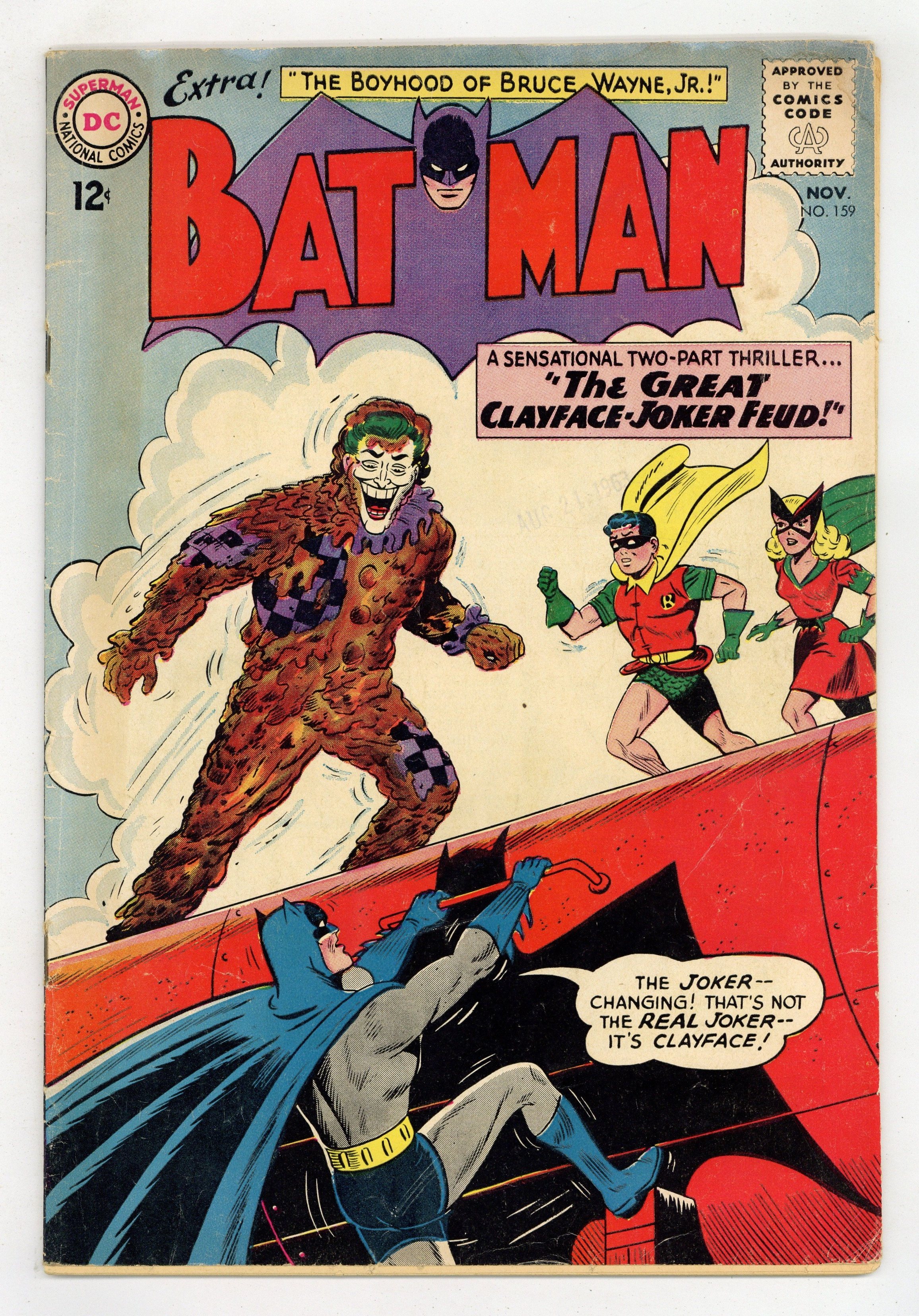 Starts Dec 22 Cover art by Sheldon Moldoff. Your United Nations at Work public service announcement. "The Great Clayface - Joker Feud," script by Bill Finger, pencils by Sheldon Moldoff, inks by Charles Paris; After escaping from prison, Matt Hagen finds a way to synthesize the liquid that turns him into Clayface, and once more takes up crime; The Joker, meanwhile, objects to Clayface getting all the headlines, so he starts a feud with Clayface. True Crime Laffs humor/nonfiction page by Henry Boltinoff. "The Boyhood of Bruce Wayne Jr.," script by Bill Finger, pencils by Sheldon Moldoff, inks by Charles Paris; Robin II takes after his father and is able to help Batman by discovering the secret escape method employed by the Green Owl Gang. 36 Pages, Full Color. Cover price $0.12.