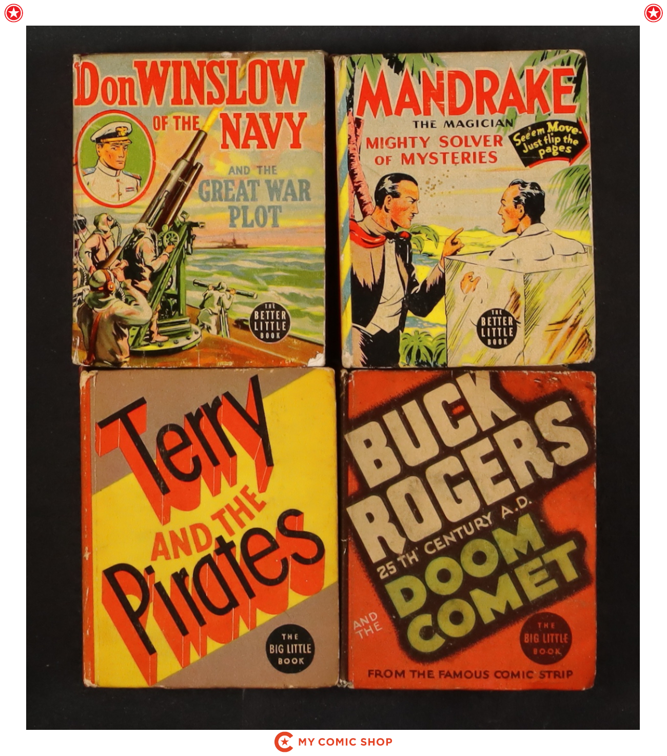 Issues Buck Rogers and the Doom Comet (1935 Whitman BLB) 1176; Terry and the Pirates (1935 BLB) 1156; Don Winslow of the Navy and the Great War (1940 Whitman BLB) 1489; and Mandrake the Magician Mighty Solver of Mysteries (1941 Whitman BLB) 1454. Most will grade in the VG- to VG+ range.