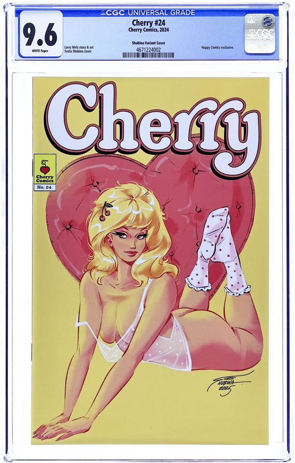 Ends Apr 17 7:48 PM CST Bid History 13 bids Current Bid $121 Your Secret Max Bid If you'd like to bid, please log in or register. Happy Comics Exclusive "Purple" Subscription Edition Variant Cover by Adam Hughes - limited to 500 copies. Originally sold with a Certificate of Authenticity. Story and Art by Larry Welz. Cherry #24 is bigger, longer, and harder than ever. It's a 48 page monster that has the next two chapters of the exciting ongoing epic. This issue also features All New Cherry Pin Ups by, Scott Diggs Underwood (Ed Edd n' Eddy, The Addams Family), Joe Pekar (Grimm Fairy Tales), Tuco El Buitre (Mademoiselle De Sade), Robert Ullman (Atom Bomb Bikini), Chance Wolf (Spawn, The Pitt), PHILO (Tales of Shaundra), Aaron Bordner (Alice Sinn, Monster High School) & Steven S. Crompton (Demi The Demoness). With Guest Strips by MastaJWood (Marvel, Dynamite), Shlepzig (Red, File 2231), & Gary Yap (Simpsons, King of the Hill).