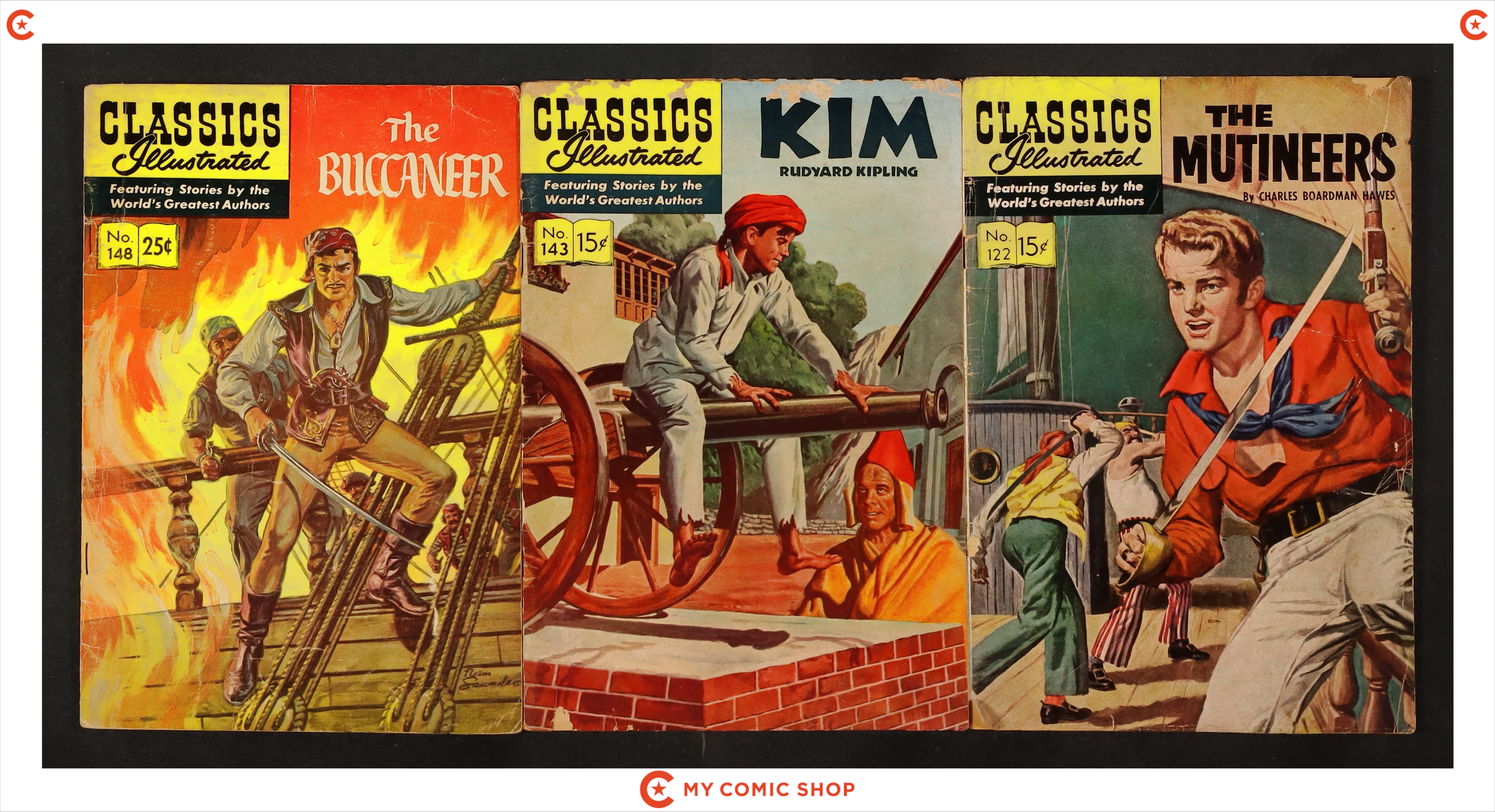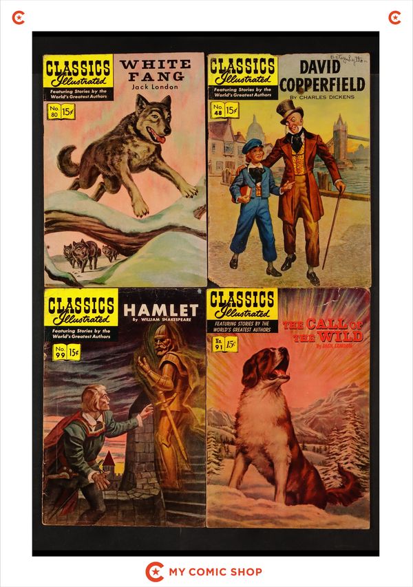 Issue 6 of Classics Illustrated 048 David Copperfield (1965), issue 5 of Classics Illustrated 080 White Fang (1951), issue 5 of Classics Illustrated 091 The Call of the Wild (1951), issue 3 of Classics Illustrated 099 Hamlet (1952), issue 2 of Classics Illustrated 122 The Mutineers (1954), issue 1 of Classics Illustrated 143 Kim (1958), and issue 5 of Classics Illustrated 148 The Buccaneer (1959). Most will grade in the GD to VG range.