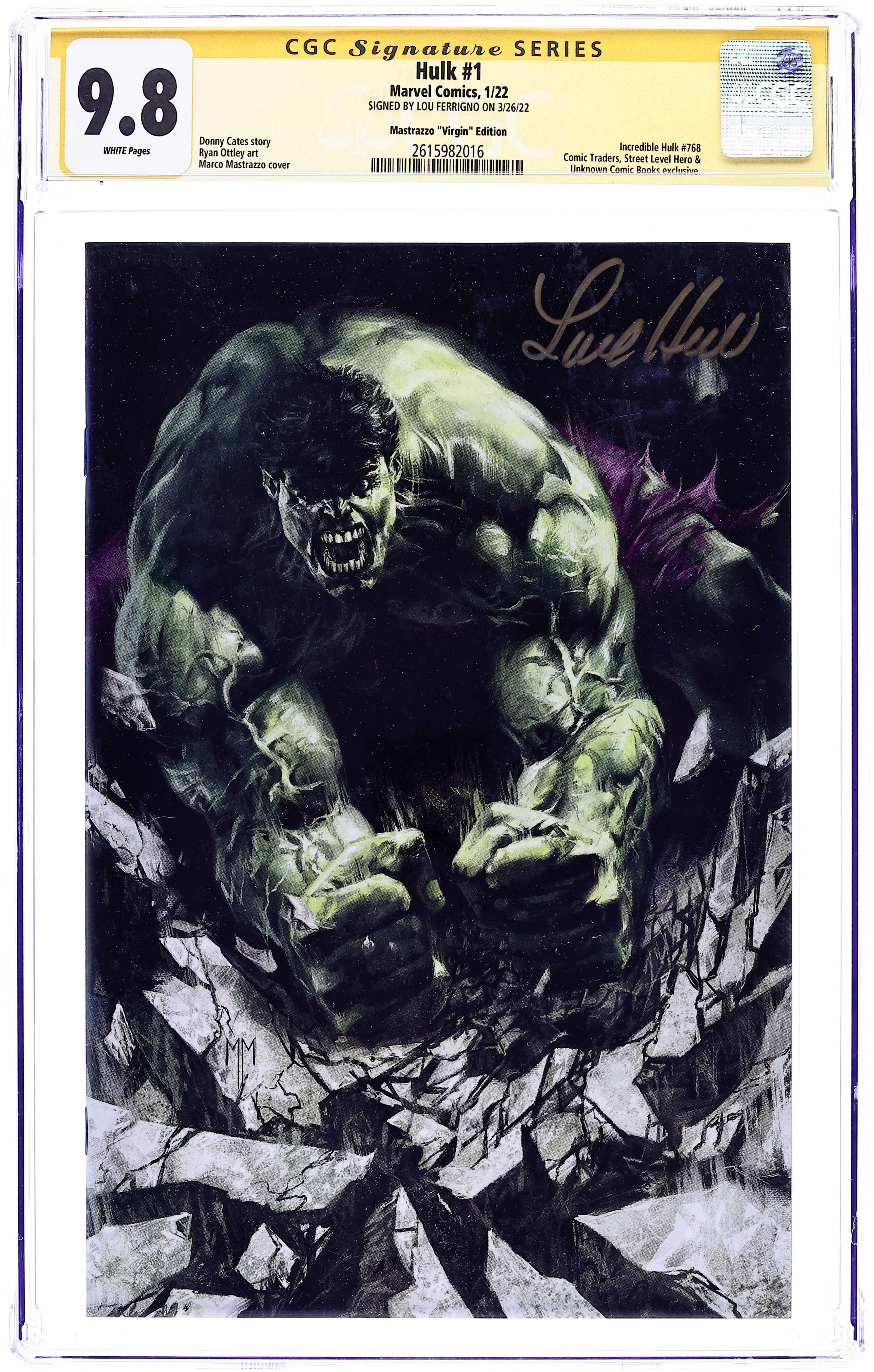 Signed by Lou Ferrigno on 3/26/22. Mastrazzo "Virgin" Edition.