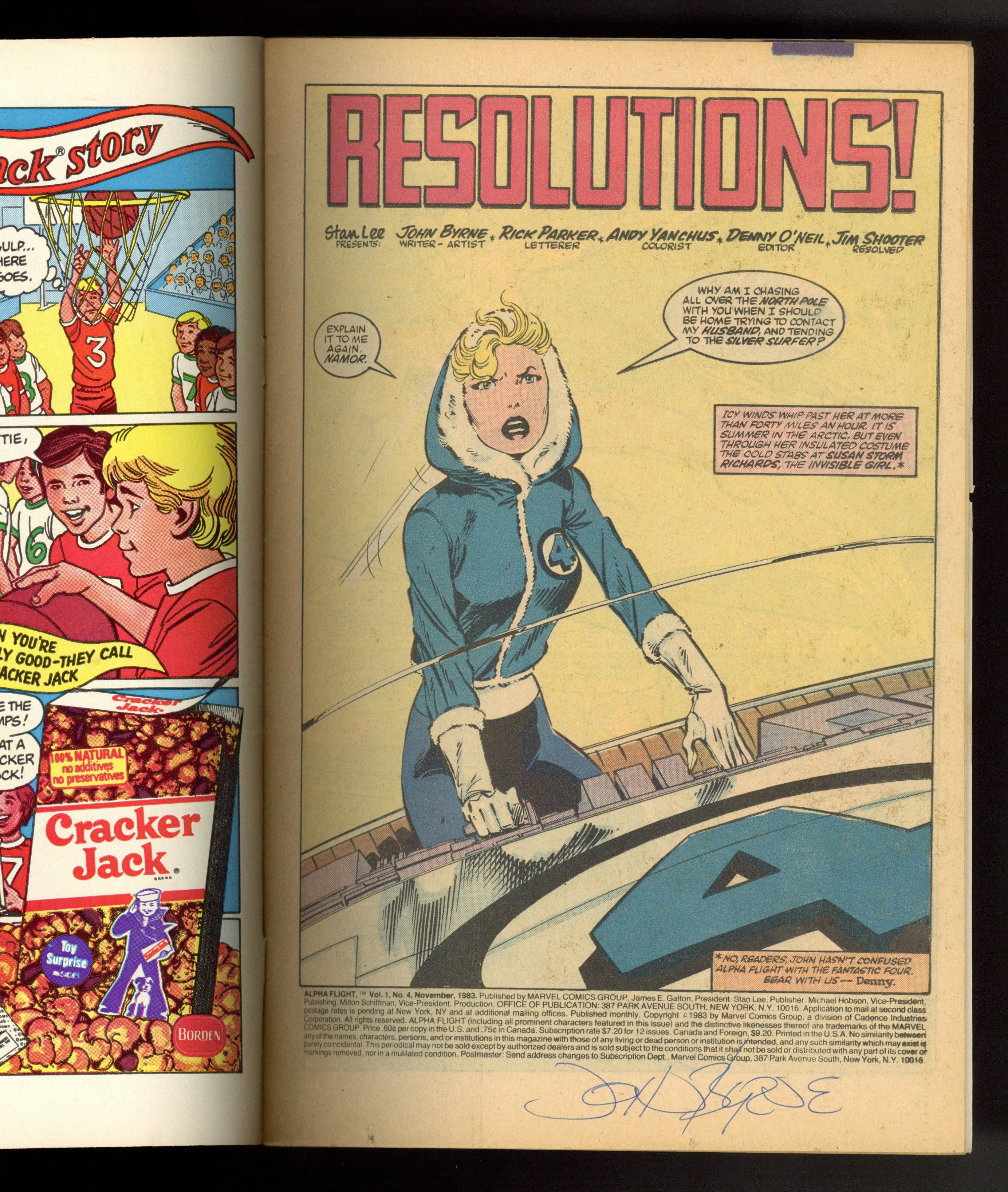 Starts May 11 "Resolutions!" Guest-starring Sub-Mariner and Invisible Woman. Part 3 of 3. Story and art by John Byrne. Story continued from Fantastic Four (Vol. 1) #260. The Master reveals the truth behind his interest in the aquatic heroine, Marrina. Meanwhile the rest of Alpha Flight continues to battle the villain's considerable defenses to reach their teammate. Plus, the mighty Sub-Mariner and the Invisible Woman from the famed Fantastic Four arrive on the scene to lend a hand. Cover price $0.60.
