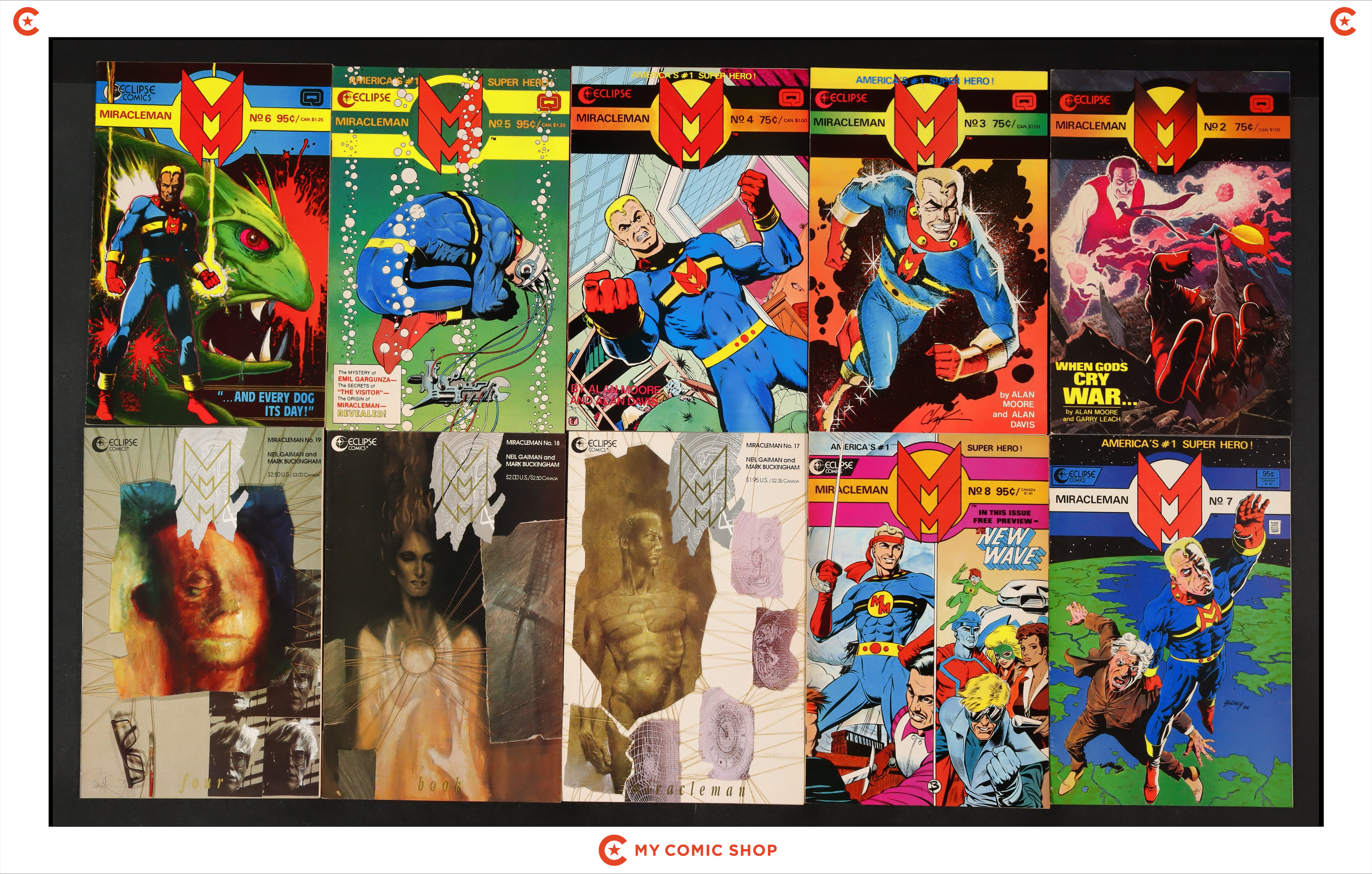 Issues 2, 3, 4, 5, 6, 7, 8, 17, 18, 19 of Miracleman (1985). Most will grade in the FN- to VF- range.