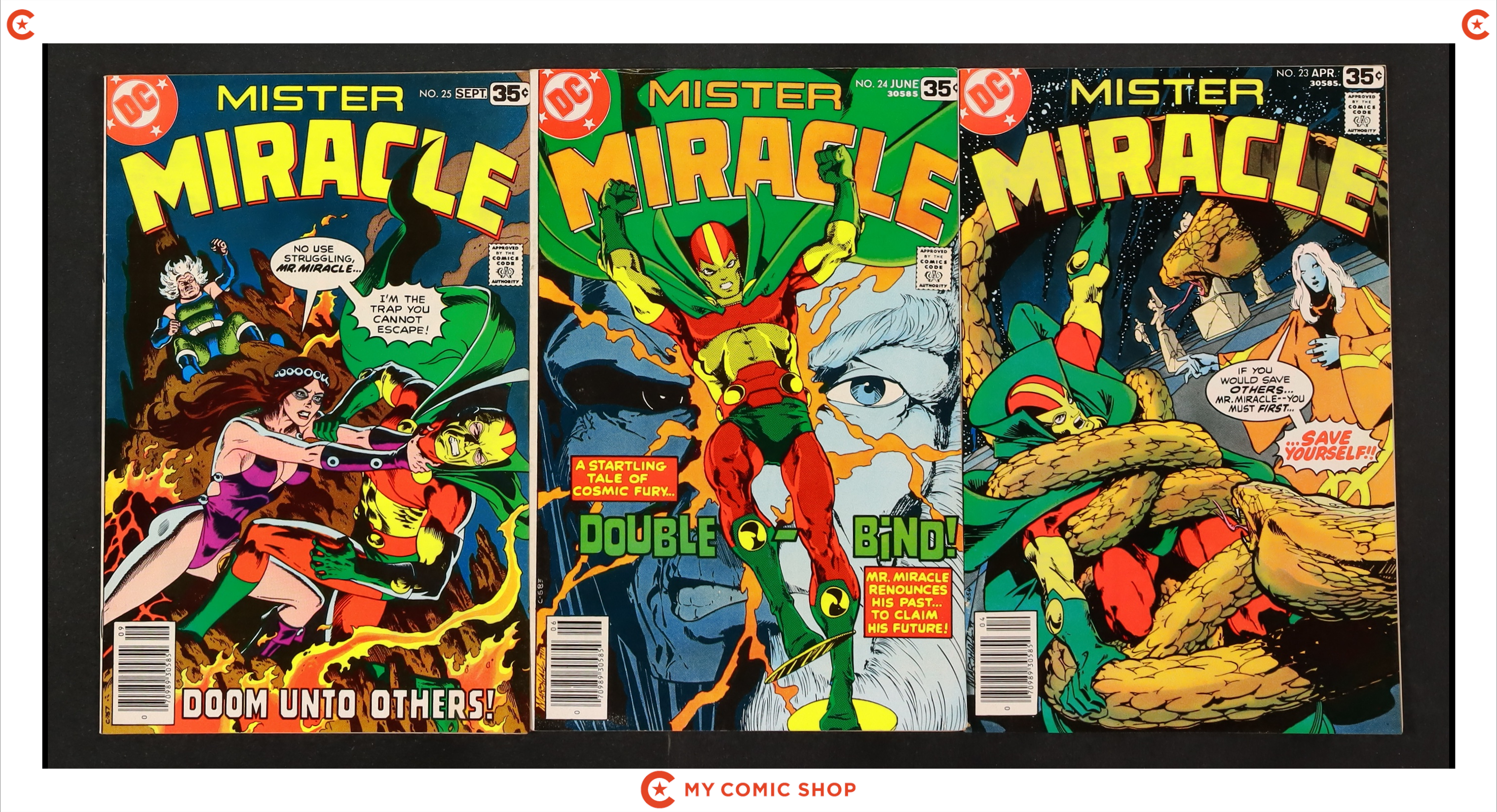 Issues 3, 6, 8, 9, 10, 19, 20, 21, 22, 23, and 24 of Mister Miracle (1971 1st Series). Most will grade in the VG to FN range.