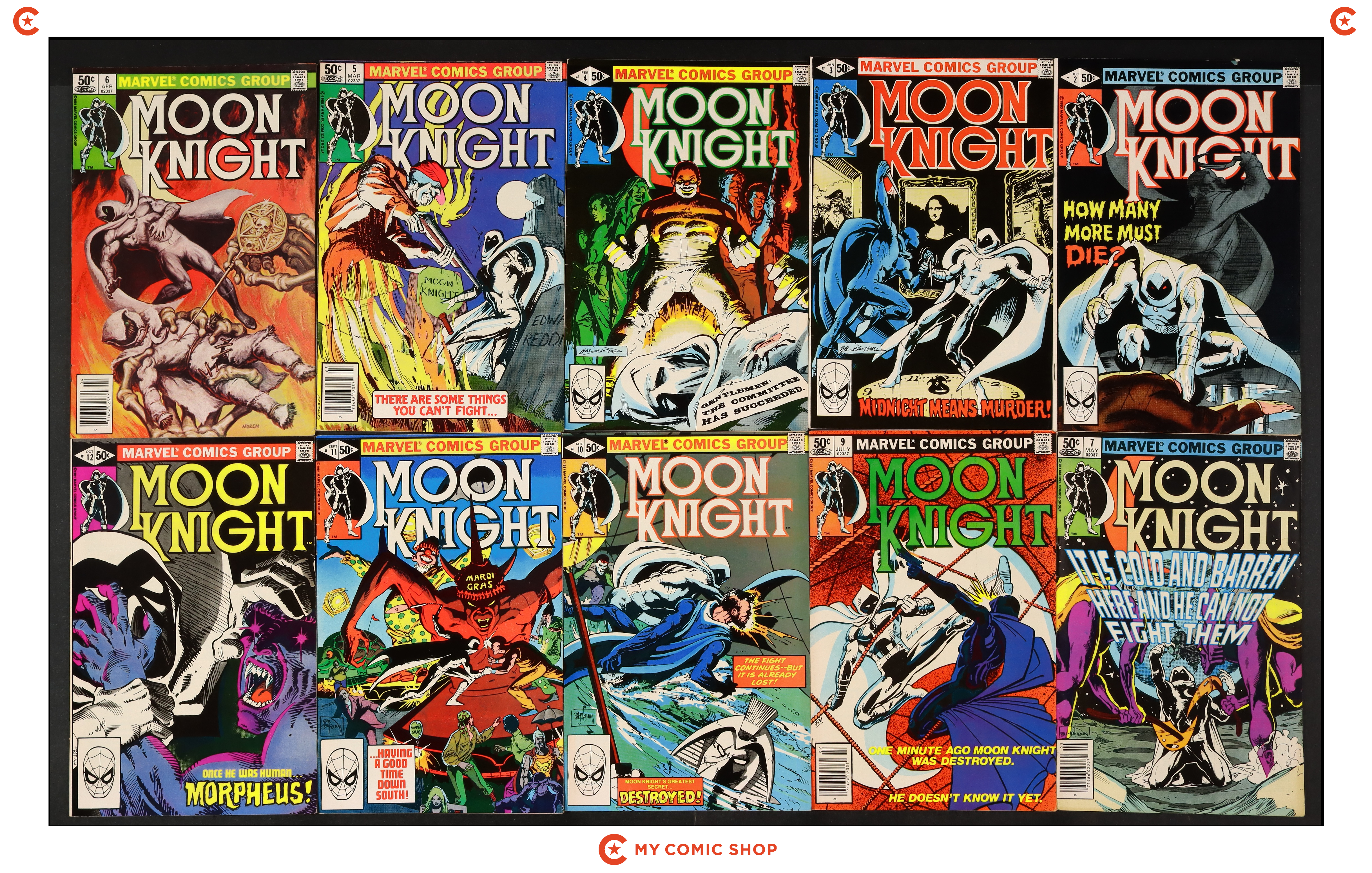 Issues 2, 3D, 4, 5N, 6N, 7N, 9N, 10D, 11, 12 of Moon Knight (1980 1st Series) . Most will grade in the FN- to FN/VF range.