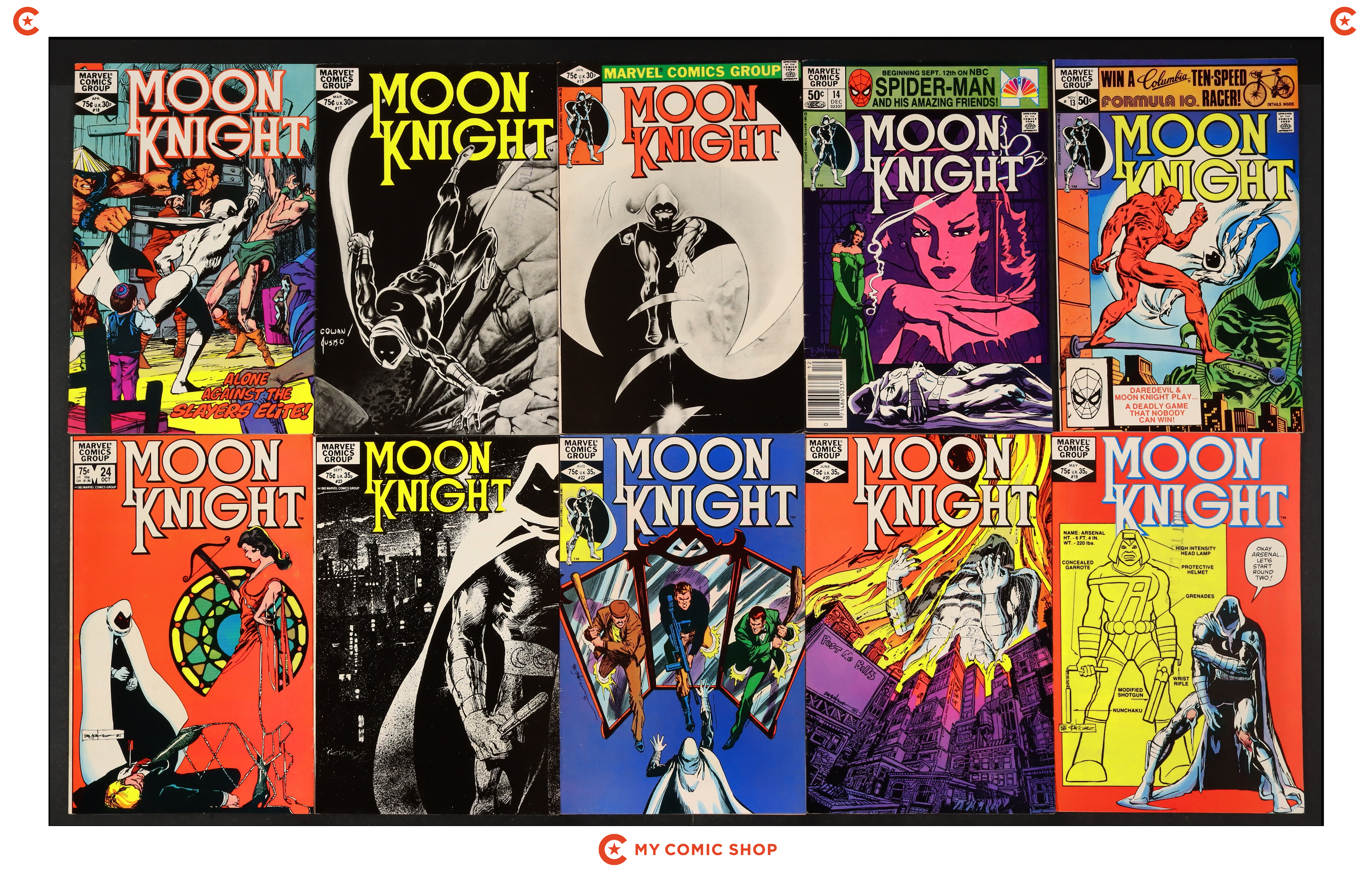 Issues 13D, 14N, 15, 17, 18, 19, 20, 22, 23, 24 of Moon Knight (1980 1st Series). Most will grade in the VG/FN to FN/VF range.
