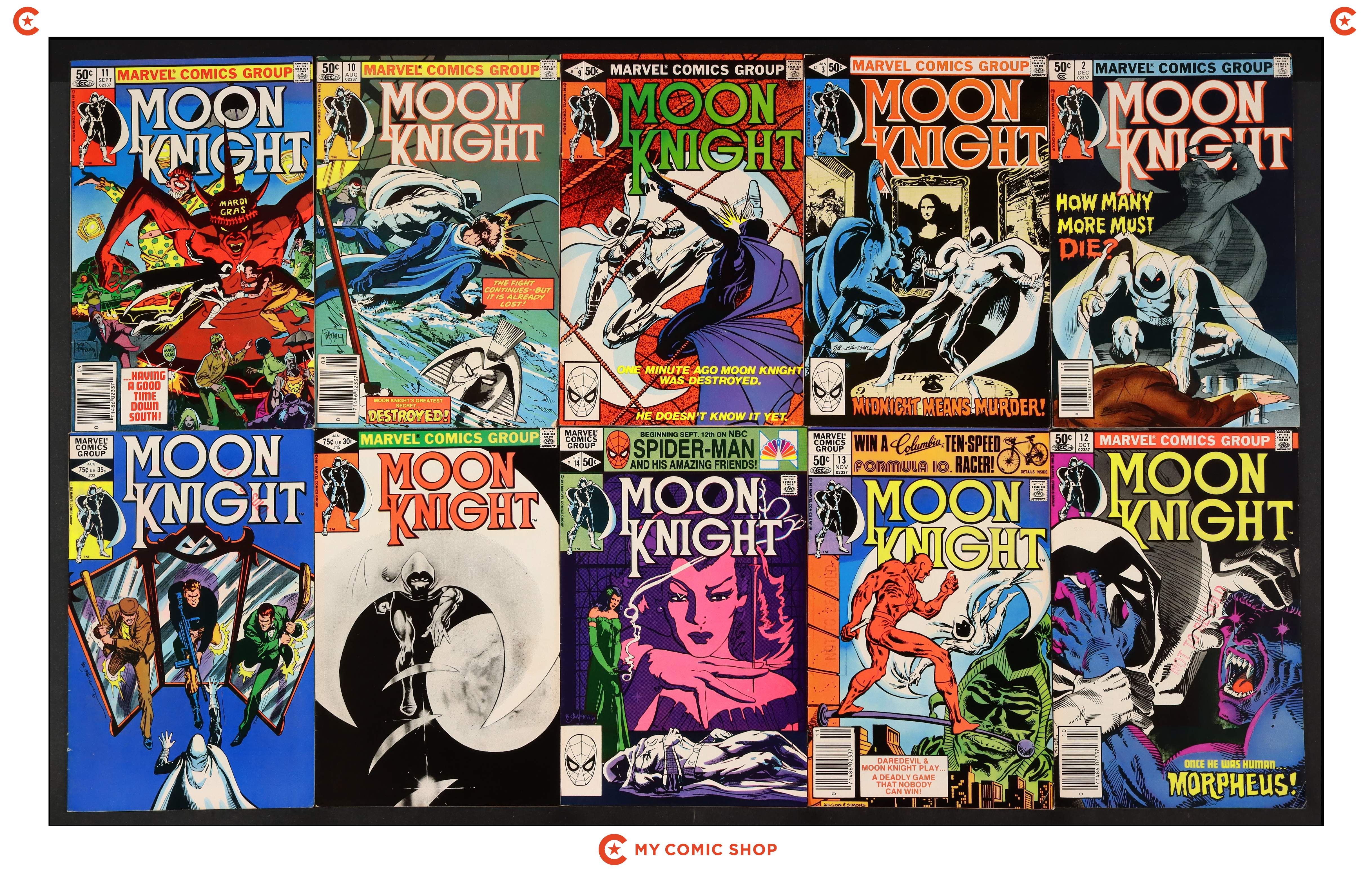 Issues 2N, 3, 9, 10N, 11, 12, 13N, 14, 15, and 22 of Moon Knight (1980 1st Series). Most will grade in the FN range.