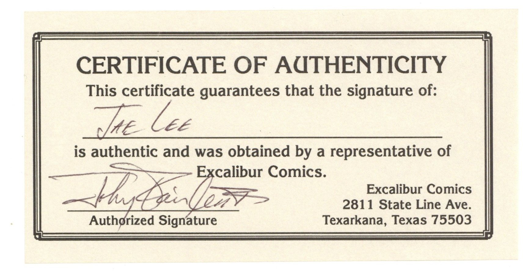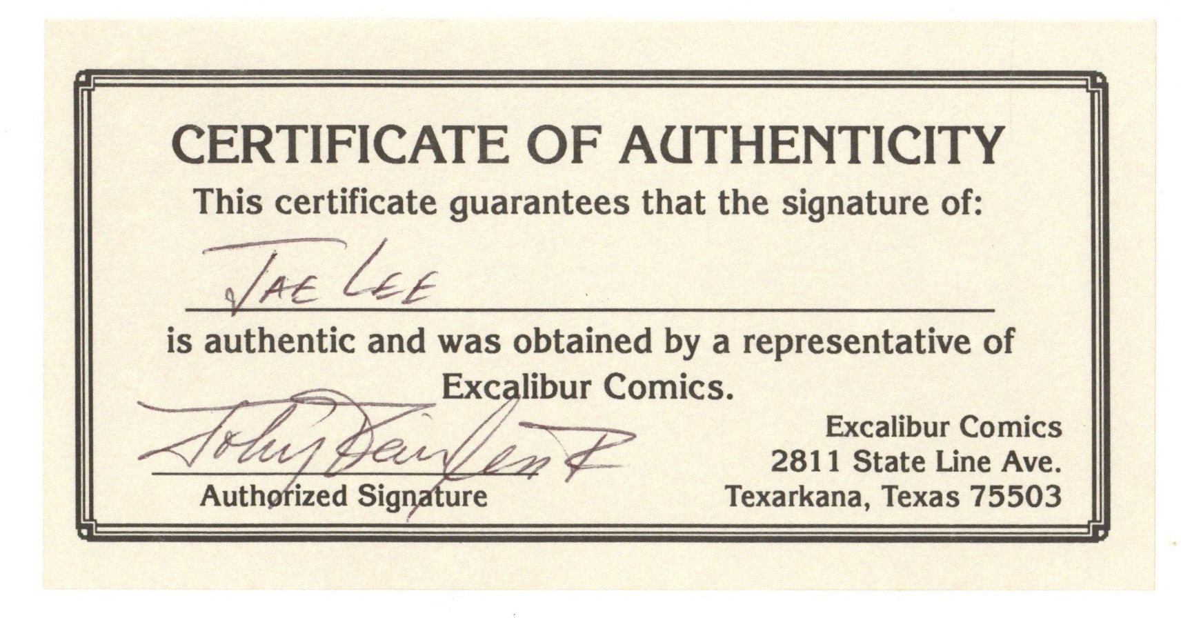 Signed by Jae Lee. Autograph certification Provided by Excalibur comics is included. Staple rust.