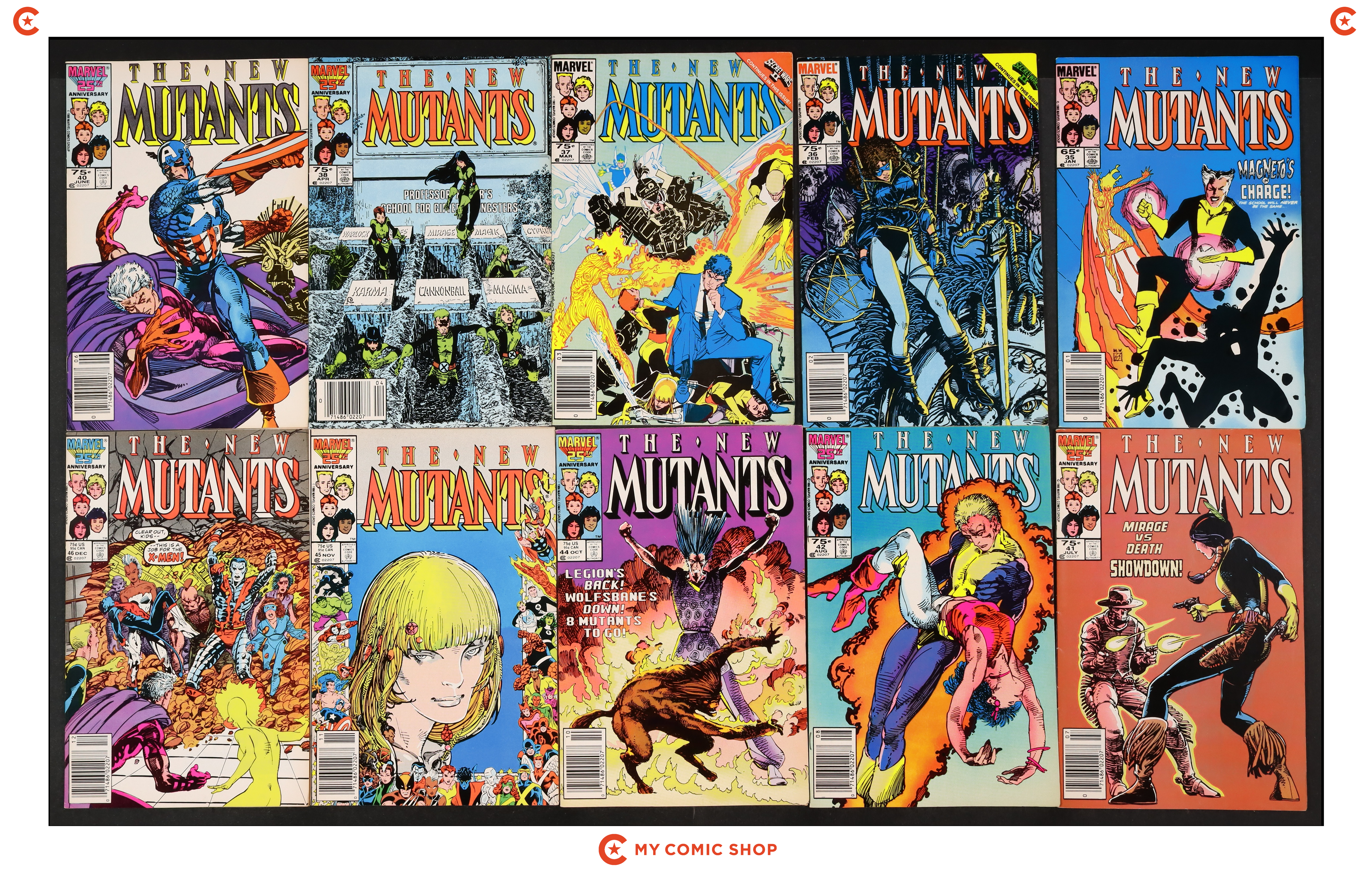 Starts Apr 20 Direct Edition. Regular series begins (first appearance is in Marvel Graphic Novel 4). Cover art by Bob McLeod. Initiation!, script by Chris Claremont, pencils by Bob McLeod, inks by Mike Gustovich; The New Mutants get acclimated to their new home, new talents, new friends, and new teachers, unaware that they are being watched; Moira learns that Professor X has a son; and Psyche is attacked in the Danger Room by an unknown assailant; Origin of Karma. Second appearance of the New Mutants (after Marvel Graphic Novel #4). Cover price $0.60.