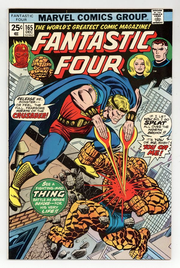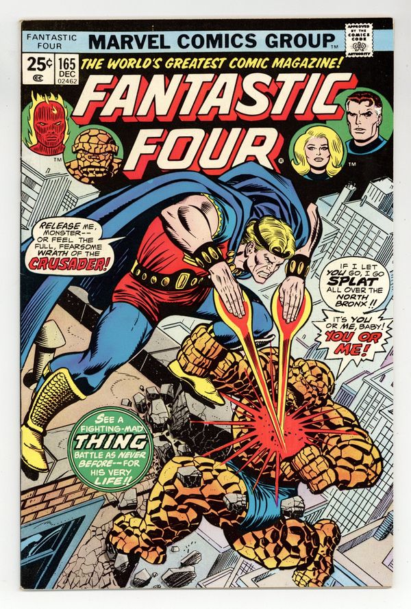Starts Jan 19 "The Light of Other Worlds!" Part 2 of 2. Script by Roy Thomas. Art by George Perez (breakdowns) and Joe Sinnott (finishes). Cover by Ron Wilson and Joe Sinnott. The Crusader's bizarre attacks on banks across Manhattan continue! But Reed has figured out the villain's pattern! And now the Fantastic Four make a beeline to the Bronx to intercept the Crusader! The battle at the bank rages from the rooftop to the vault to the street! Can the FF shut down the Crusader? Origin of the Crusader (aka Robert Grayson). Flashback cameo by Dr. Horace Grayson. Notes: The Crusader's quantum bands are eventually inherited by Wendell Vaughn (aka Quasar). The letters page includes a letter from comics writer Peter Gillis.) 36 pages Cover price $0.25.