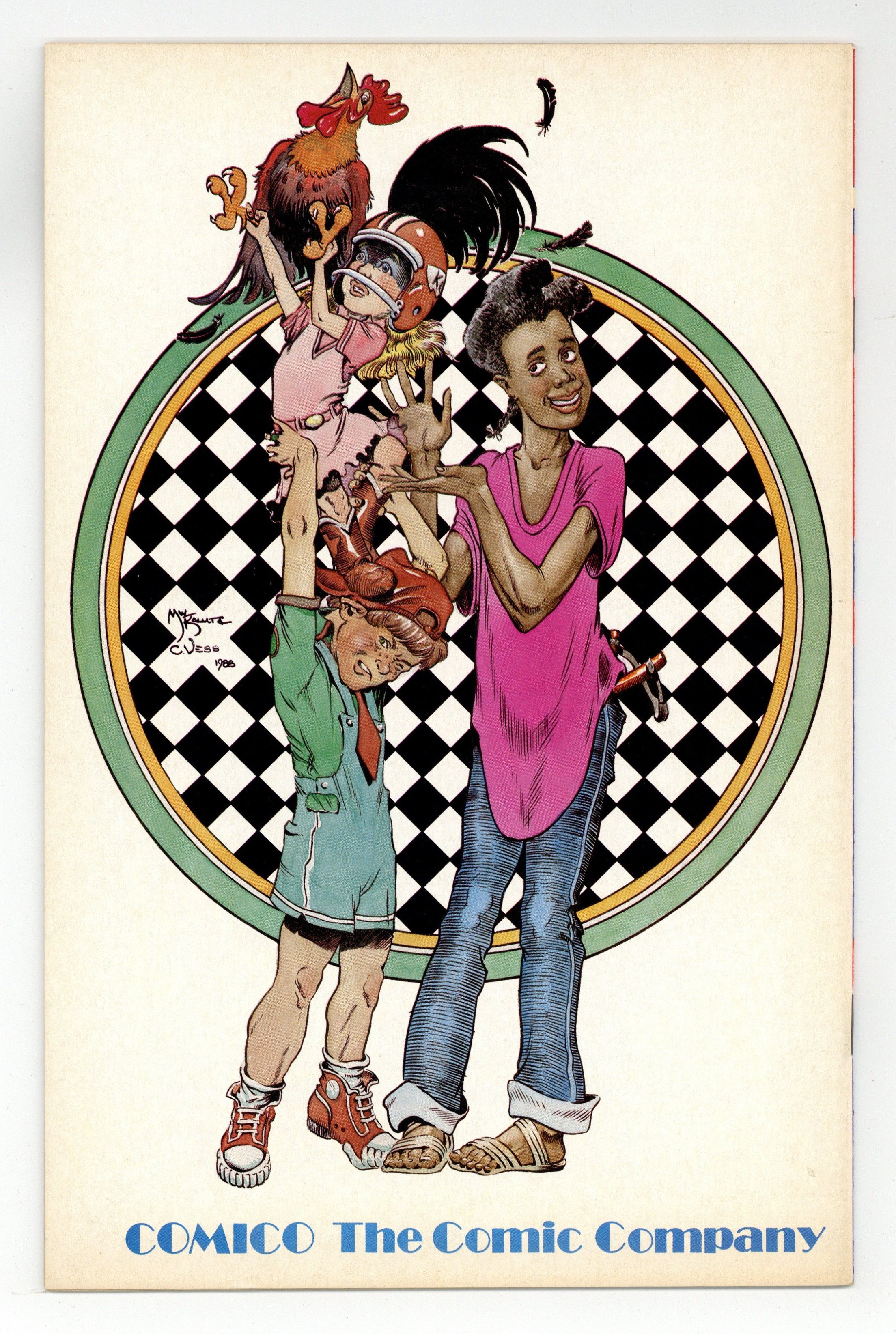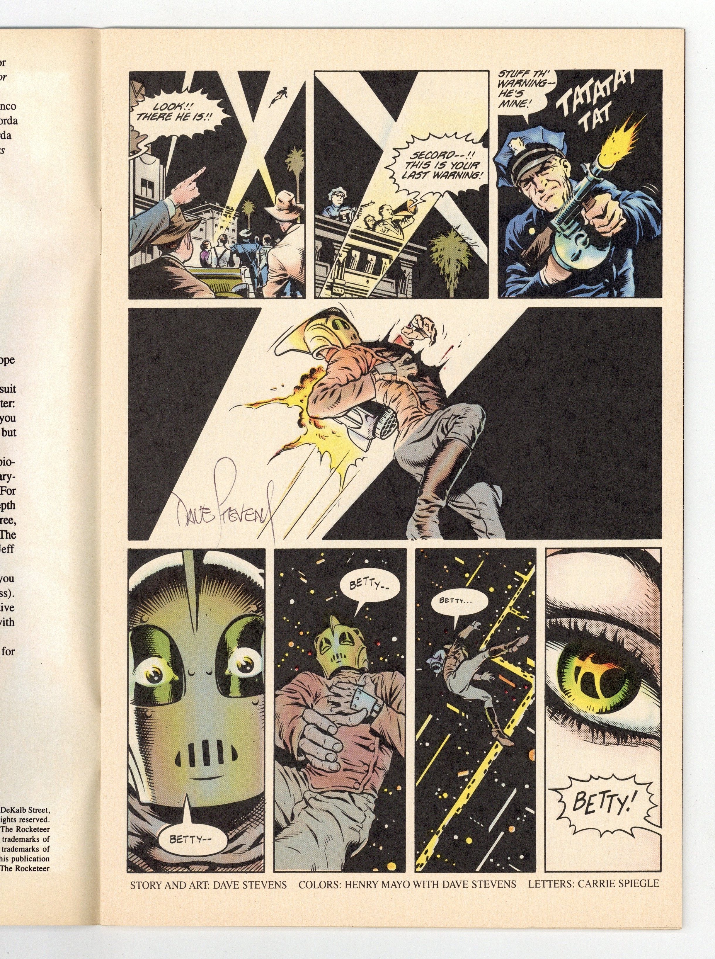 Starts Feb 16 Cover by Dave Stevens. "Cliffs New York Adventure" 14 pages. Part 6 of 8. Story continues from Rocketeer Special Edition. Story and art by Dave Stevens. Cliff follows Betty to New York before she sets off for Europe. But the reunion might not go exactly as planned. "George Townson. Flying the Autogiros." 4 pages. Text feature. "Buy, Buy, Birdie." 10 pages. Story by Elaine Lee. Pencils by Michael Kaluta. Inks by Charles Vess. Attempting to win a badminton contest, the Galactic Girl Guides develop a birdie shooting robot. Should have left out the real bird eggs though. 32 pages. Full color. Cover price $2.00.