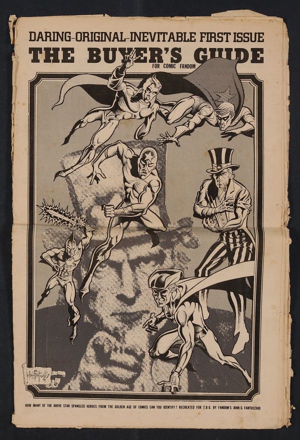 Starts Apr 20 Alan Light's "The Buyer's Guide for Comic Fandom" made its debut with this issue which featured a John G. Fantucchio's iconic cover, a nice introduction article by Jan Steven Strnad, and, of course, ads. Includes a 1/2 page ad from Buddy Saunders, owner of Lone Star Comics and mycomicshop.com. Most of the biggest ads were for various fanzines available at the time, such as Bill G. Wilson's "The Collector," various Captain George publications, "Helix," "Infinity," and others. Circulation, according to Light's editorial info in the indicia on Page 2, was "approximately 3,500." Also on Page 2 were the ad rates -- $16 for a full page ad, and $9 for a half-pager. 20 pgs, B&W on newsprint. Cover price $2.00.
