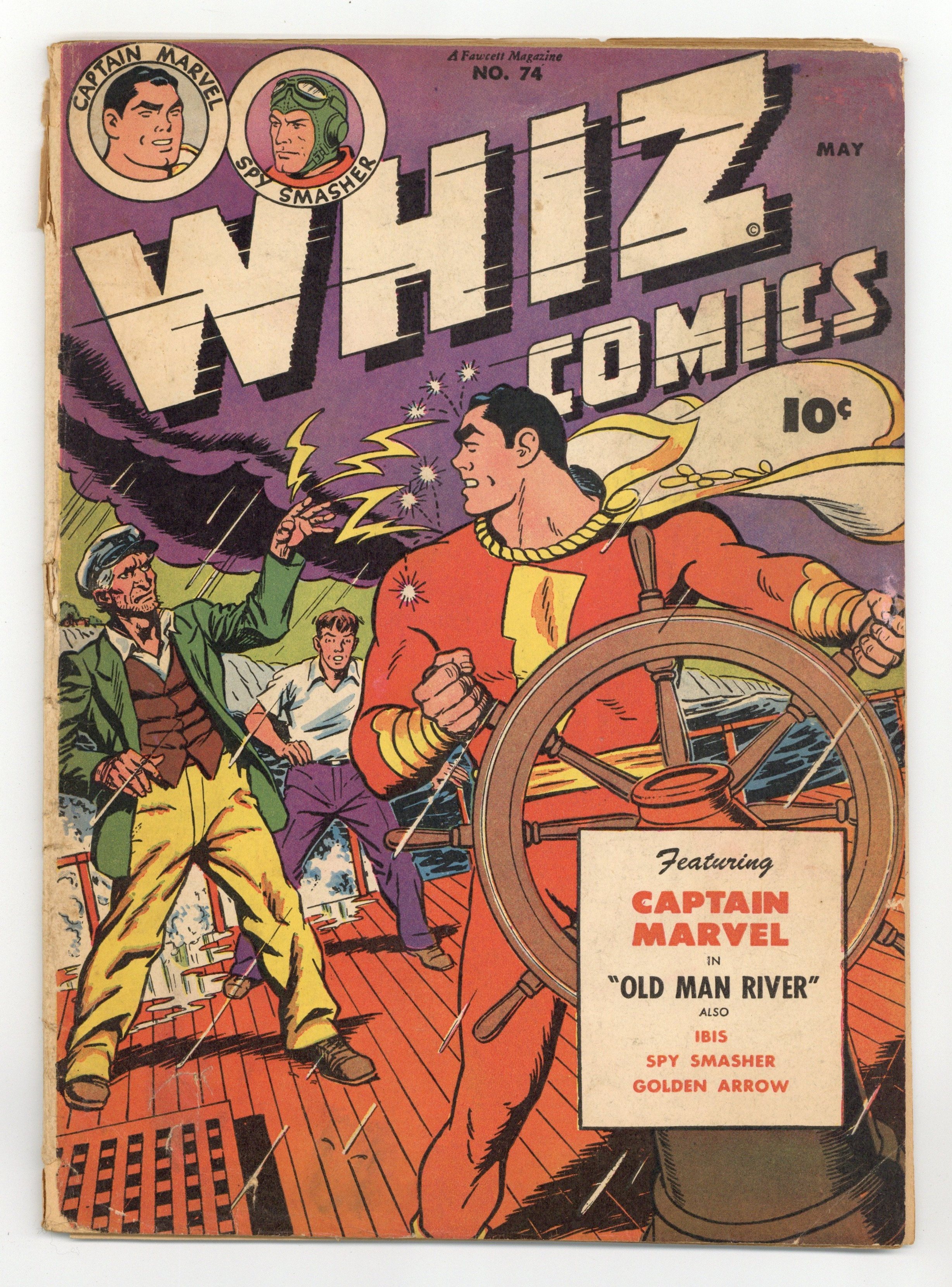 Starts Mar 16 Cover by C. C. Beck. Stories and art by Basil Wolverton, Otto Binder, Kurt Schaffenberger and Bill Woolfolk. The Fawcett comic that introduced the original Captain Marvel (Shazam) to the world. Captain Marvel faces a rogue sea captain with strange powers. Ibis uses magic to discover how the con is performed at a rigged horse race. Plus a "Culture Corner" strip by legendary cartoonist Basil Wolverton, featuring useless but hilarious advice on "How to Boot a Fly off Your Snoot." Captain Marvel and Old Man River; Horace Hotstuff; Golden Arrow: The Horse's Hoax; Whitey Whiskers and Daniel Boone Jr.; Wilbur the Waiter; Spy Smasher: The Exploding Mains; Night Chase; Whipper-Snappers; The Culture Corner; Ibis the Invincible: Ibis Goes to the Races; Doc Sorebones; Mickey the Monitor Dishes It Out; Captain Marvel: The Berserk Giant. 48 pages, Full Color. Cover price $0.10.