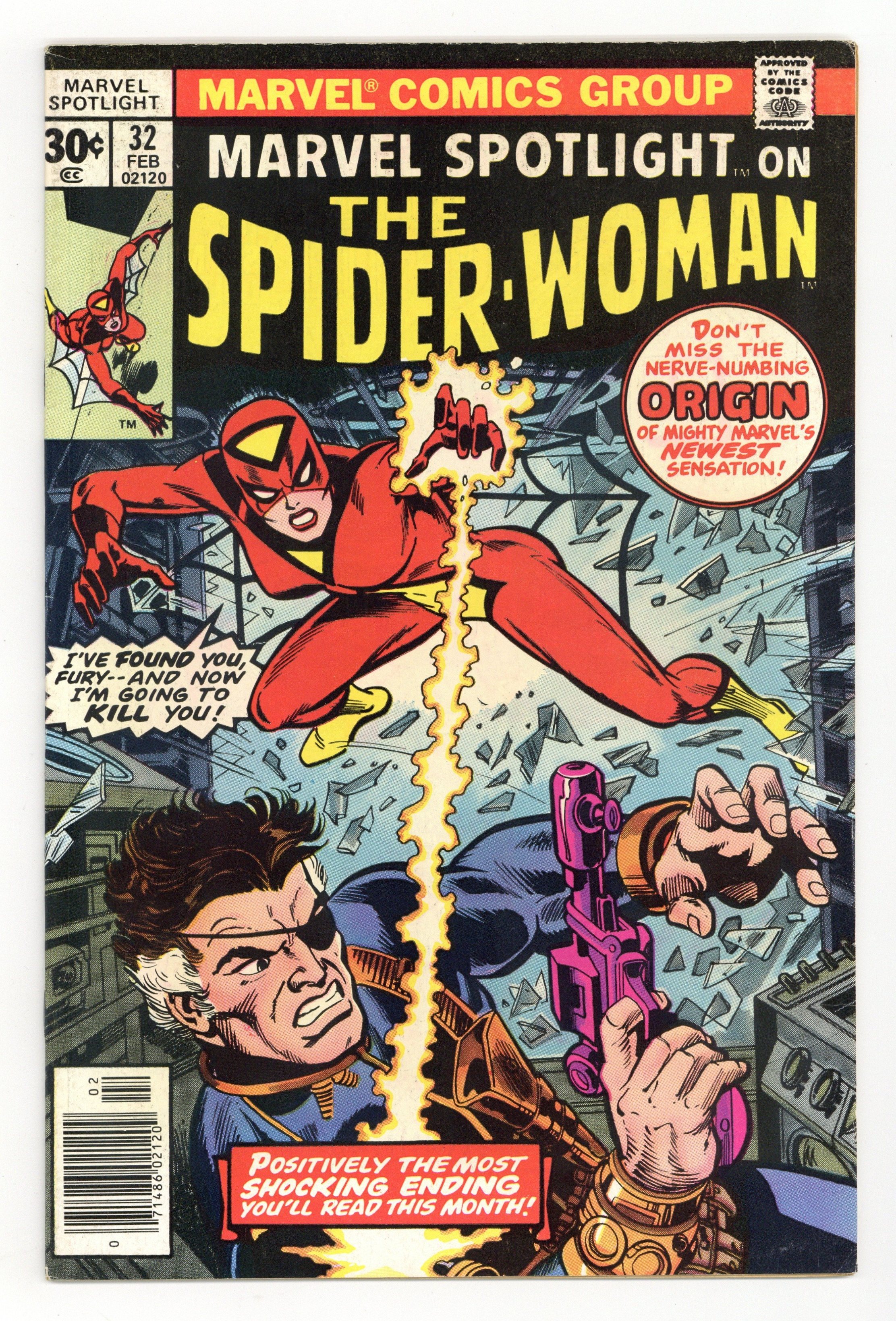 Starts Apr 20 Origin and 1st appearance of Spider-Woman. Cover pencils by Gil Kane and John Romita (alterations), inks by Dick Giordano (?) and John Romita (alterations). Dark Destiny!, script by Archie Goodwin, pencils by Sal Buscema (breakdowns) and Jim Mooney (finished art), inks by Jim Mooney; the mysterious Spider-Woman is tricked by Hydra into trying to kill Nick Fury. Continued in Spider-Woman #1. 36 pages, full color. Cover price $0.30.