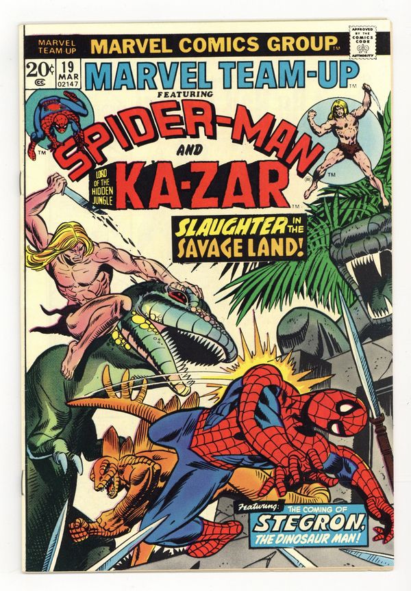 Starts Feb 9 Spider-Man and Ka-Zar in "The Coming of Stegron the Dinosaur Man!" Part 1 of 2. Script by Len Wein. Pencils by Gil Kane. Inks by Mike Esposito and Frank Giacoia. Cover by Gil Kane and Frank Giacoia. Spider-Man and Ka-Zar battle Stegron in the Savage Land. First appearance of Stegron. (The wall-crawler previously visited the Savage Land in Amazing Spider-Man 104. This issue was reprinted in Marvel Treasury Edition 22. The letters page contains Marvel Value Stamp Series A #90 Hercules.) Note: First appearance of Stegron. 36 pgs. Cover price $0.20.