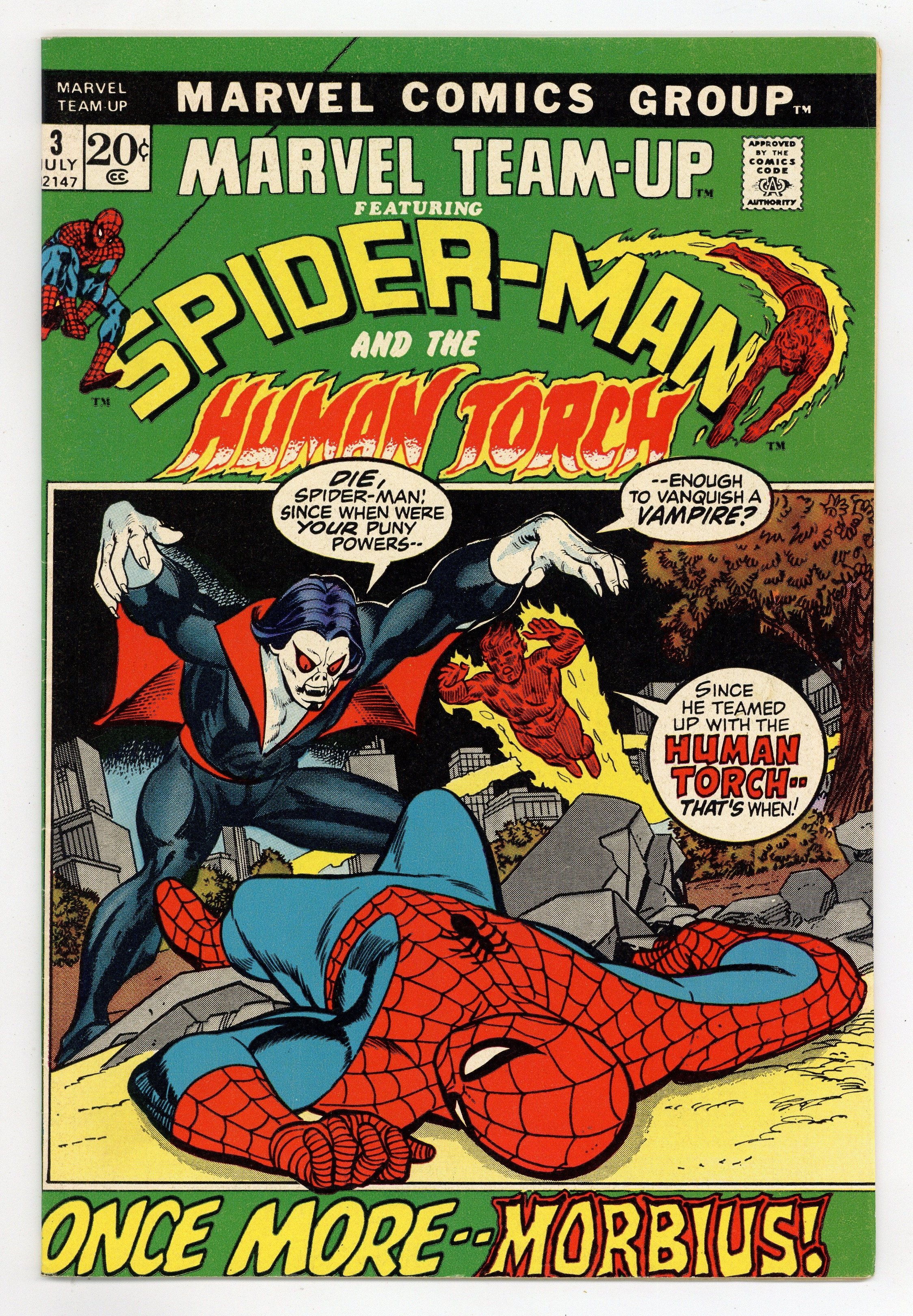 Starts Apr 20 "The Power to Purge!" Part 1 of 2. Guest-starring Spider-Man and the Human Torch. Script by Gerry Conway. Pencils by Ross Andru. Inks by Frank Giacoia. Cover by Gil Kane and Vince Colletta. The web-slinger and the Human Torch team up for the third issue in a row to take on Spider-Man's newest adversary! At the end of Amazing Spider-Man 102, Morbius the Living Vampire survived his plunge into the river. And now he's on the hunt again! Near the Empire State University campus, the torch and the wall-crawler catch up to Morbius! But under a full moon, no one is beating the Living Vampire. Stalemate is the best possible outcome against the bloodthirsty Morbius. Cameo appearances by Martine Bancroft, Mr. Fantastic, Invisible Girl, and the Thing. (Notes: This issue is the third appearance of Morbius. Parts of the story are reprinted in Spectacular Spider-Man (1st series) #6. The letters page includes a letter from comics writer Bob Rozakis.) 36 pages. Cover price $0.20.