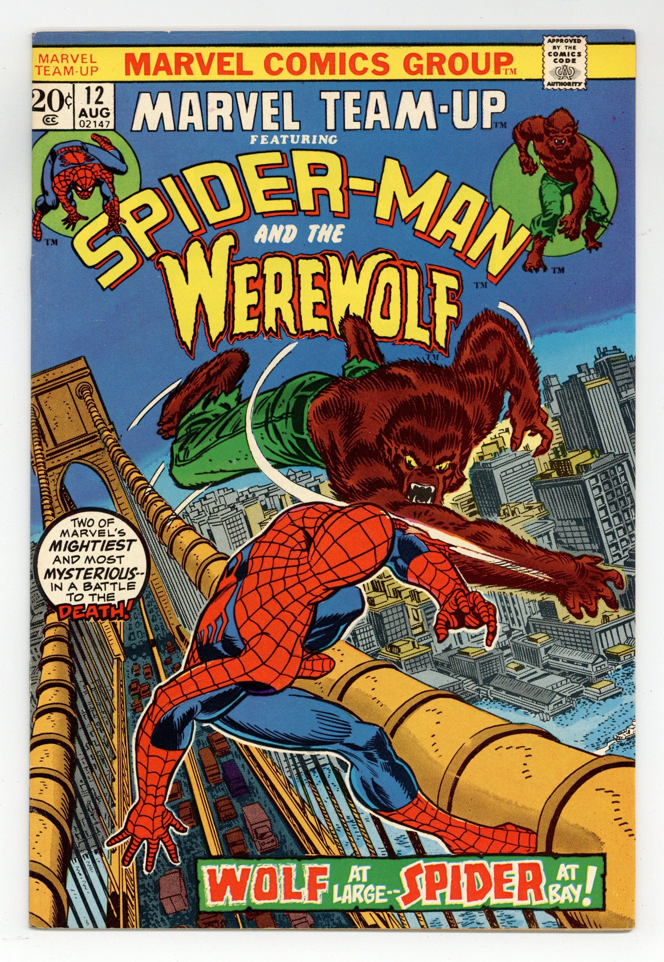 Starts Apr 20 "Wolf at Bay" Guest-starring Spider-Man and Werewolf by Night. Plot by Gerry Conway. Script by Len Wein. Pencils by Ross Andru. Inks by Don Perlin. Cover by Gil Kane and John Romita. The Amazing Spider-Man is web-swinging across the Golden Gate Bridge...when he's suddenly attacked by a werewolf! And it's not just any werewolf -- it's Jack Russell aka Werewolf by Night! A strange magician -- named Moondark -- has seized control of the Werewolf...and sent him to kill the web-slinger! Can Spidey break Moondark's control of Jack...before they both wind up at the bottom of the bay? First appearance of Moondark. Cameo appearances by Buck Cowan and Lissa Russell. Flashback cameos by J. Jonah Jameson and Joe Robertson to explain why Peter Parker is in San Francisco. (Notes: Peter's assignment for the Daily Bugle continues in Daredevil 103. Moondark returns in Marvel Team-Up #91. This story takes place after Amazing Spider-Man 123.) 36 pages. Cover price $0.20.