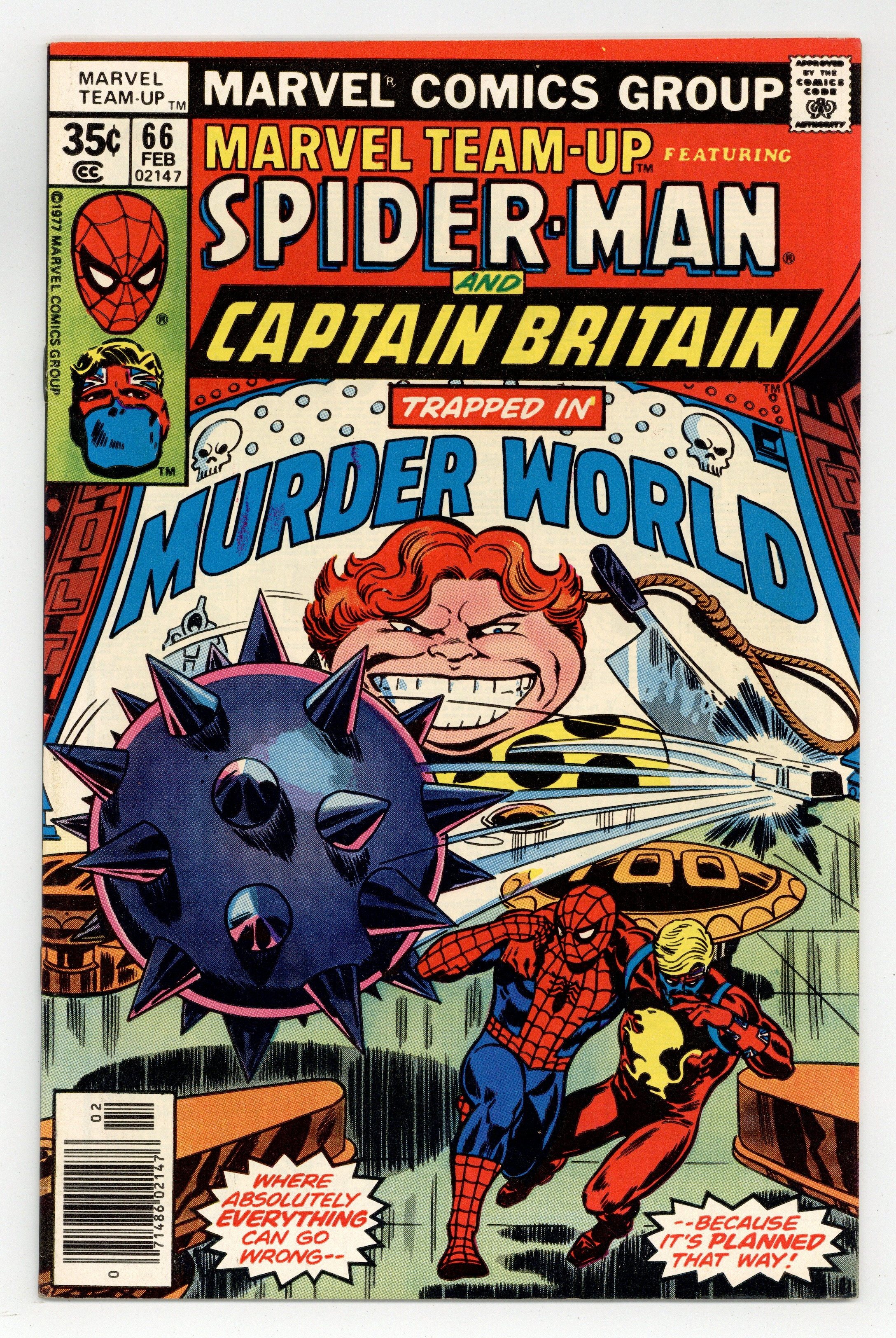 Starts Mar 23 "Murder World" Part 2 of 2. Guest-starring Spider-Man and Captain Britain. Script by Chris Claremont. Pencils by John Byrne. Inks by Dave Hunt. Cover by John Byrne and Frank Giacoia. Captain Britain and the Spectacular Spider-Man wake up inside a giant pinball machine! The two heroes are trapped in Murderworld...an amusement park for murder! Can the web-slinger and Captain Britain beat Arcade at his own game? And also save Courtney Ross in the process? First appearance of Murderworld. Cameo appearance by Captain Jean DeWolff. (Notes: Arcade appears next in Uncanny X-Men 122. This two-part story was reprinted in Marvel Tales 201 and 202.) 36 pages. Cover price $0.35.