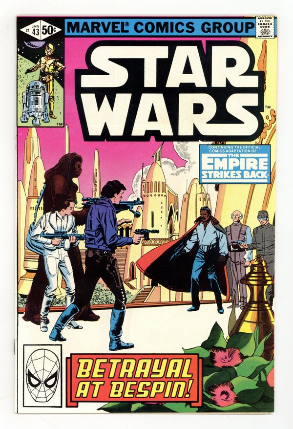 Starts Apr 4 Newsstand Edition. The Empire Strikes Back: Part 5 of 6. "Betrayal at Bespin!" Based on the screenplay by George Lucas. Adapted by Archie Goodwin. Art by Al Williamson and Carlos Garzon. After their narrow escape from the pursuing Empire Fleet, the crew of the Millennium Falcon sets down on the Cloud City of Bespin for repairs. Lando Calrissian, proprietor of the floating facility, is an old friend of Han's. But he is an old friend with some dark secrets. Meanwhile, Luke's training under the tutelage of the Jedi Master, Yoda, is cut short when the young padawan senses that his friends are in great danger. Against Yoda's better judgement Luke races to Cloud City and the stage is set for the greatest battle between the forces of good and evil. Includes 5 pin-ups by Terry Austin, Michael Golden, John Byrne, Marie Severin, and Frank Miller. Cover price $0.50.