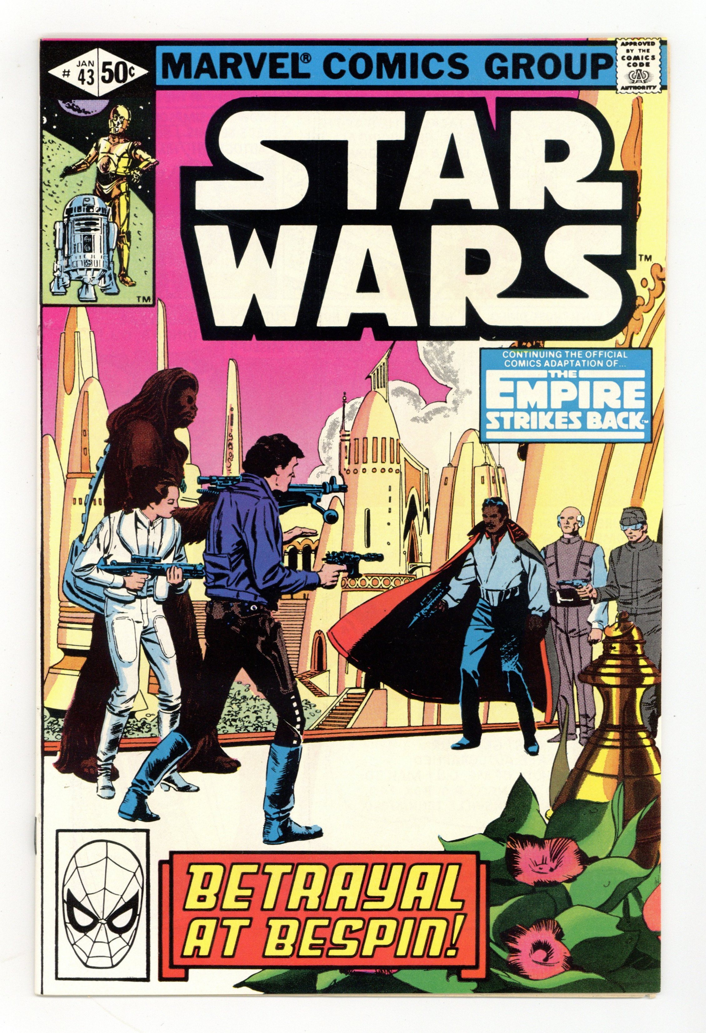 Starts Apr 27 Newsstand Edition. The Empire Strikes Back: Part 5 of 6. "Betrayal at Bespin!" Based on the screenplay by George Lucas. Adapted by Archie Goodwin. Art by Al Williamson and Carlos Garzon. After their narrow escape from the pursuing Empire Fleet, the crew of the Millennium Falcon sets down on the Cloud City of Bespin for repairs. Lando Calrissian, proprietor of the floating facility, is an old friend of Han's. But he is an old friend with some dark secrets. Meanwhile, Luke's training under the tutelage of the Jedi Master, Yoda, is cut short when the young padawan senses that his friends are in great danger. Against Yoda's better judgement Luke races to Cloud City and the stage is set for the greatest battle between the forces of good and evil. Includes 5 pin-ups by Terry Austin, Michael Golden, John Byrne, Marie Severin, and Frank Miller. Cover price $0.50.