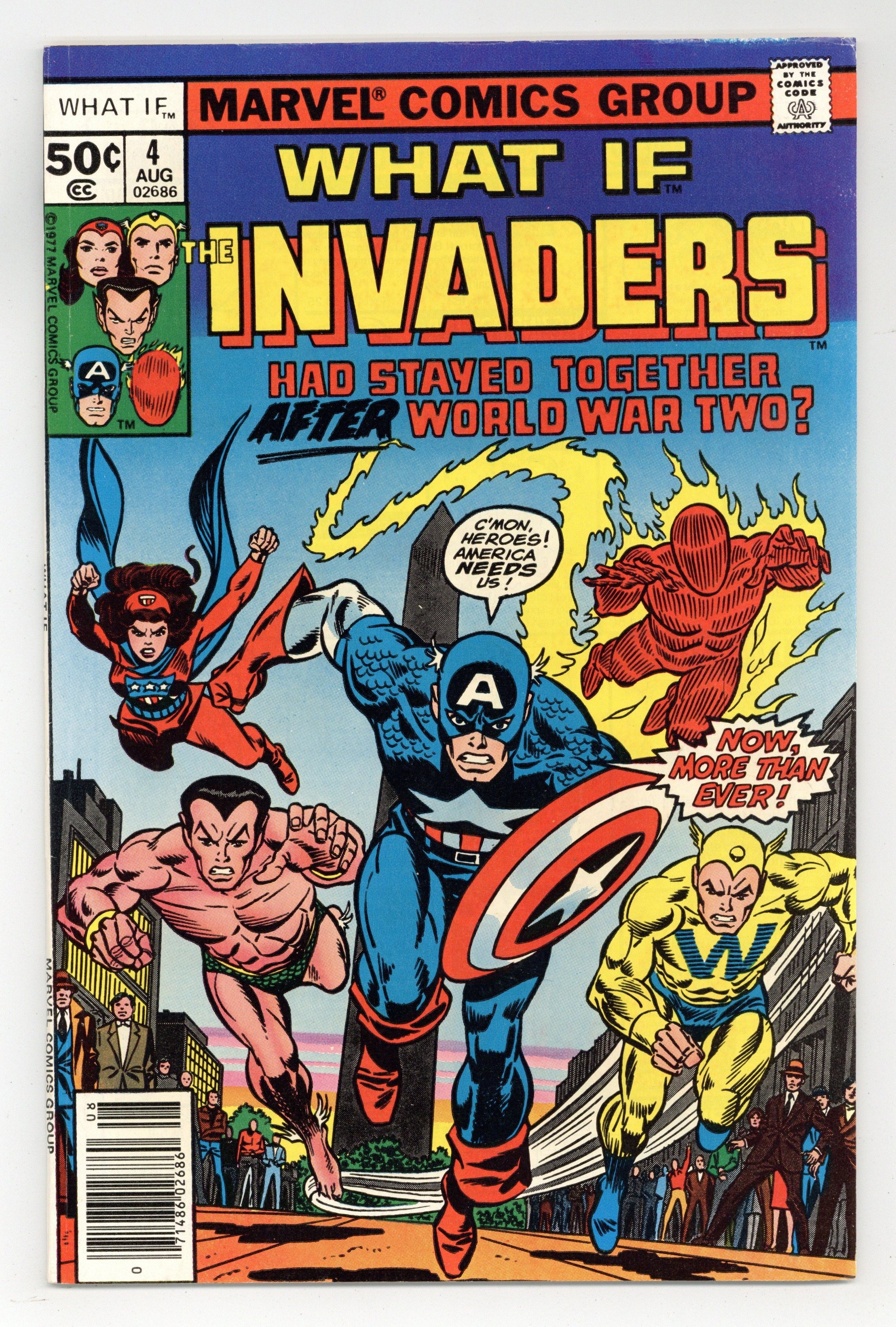 Starts Apr 27 Cover pencils by Gil Kane, inks by Frank Giacoia. What if the Invaders Had Stayed Together After World War Two? starring the Invaders, script by Roy Thomas, pencils by Frank Robbins (breakdowns) and Frank Springer (finished art), inks by Frank Springer; This story is in continuity and explains the post-1945 Captain America; It features the death of the Spirit of '76 (Cap II) and the introduction of the Patriot as Capt III. Hostess Twinkie ad with Spider-Man, pencils by Ross Andru, inks by Mike Esposito. Article by Roy Thomas called Why Not? 52 pgs. Cover price $0.50.