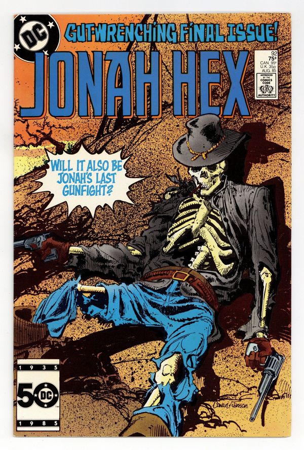 Starts Jan 19 Direct Edition. In this last issue of Jonah Hex, Jonah goes out in "A Blaze of Glory!" Hex faces off with villains in the West when he suddenly disappears from the late 1880's and reappears in the 21st century sometime after a nuclear war. Continues in Hex (1985) #1. Written by Michael Fleisher, with art by Gray Morrow. Cover by Denys Cowan and Klaus Janson. Cover price $0.75.