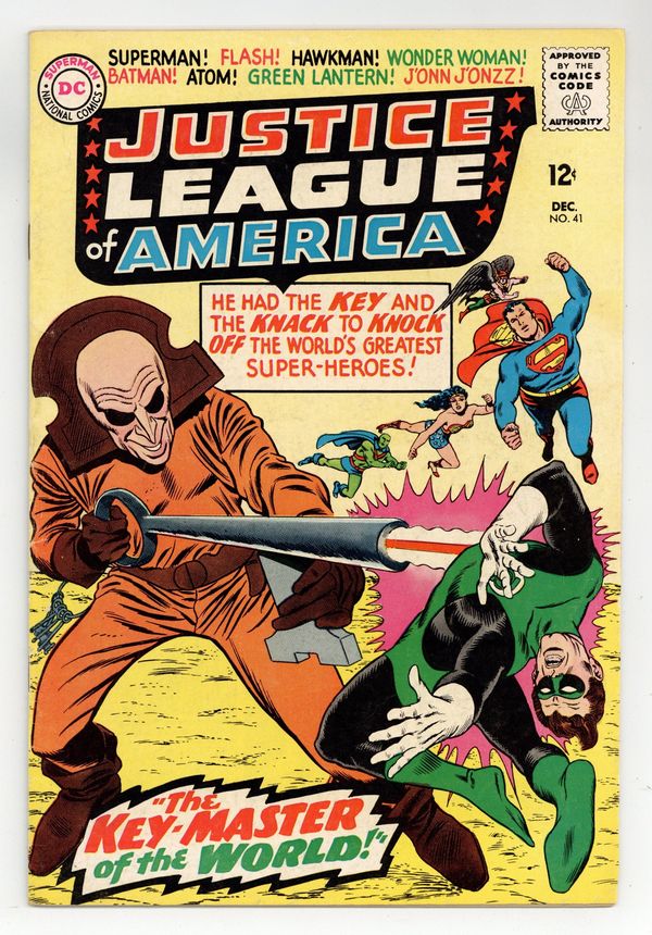 Starts Apr 20 Cover pencils by Mike Sekowsky, inks by Murphy Anderson. Builders of the Future! public service announcement, art by Sheldon Moldoff. The Key-Master of the World!, script by Gardner Fox, pencils by Mike Sekowsky, inks by Bernard Sachs; The Key administers a psycho-chemical to the JLA which forces them to disband and become unable to see his henchmen commit robberies; However, they are returned to normal when Hawkgirl discovers the situation, and go on to defeat The Key. Notes field: Hawkman uses the Absorbascon to discover the secret identities of the JLA members. Cap's Hobby Center by Henry Boltinoff. Cover price $0.12.