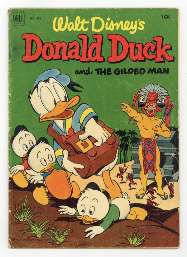 Ends Feb 16 8:20 PM CST Bid History 5 bids Current Bid $22 Your Secret Max Bid If you'd like to bid, please log in or register. Cover art by Carl Barks. Stable Prices; Scrooge complains about the price at Donald's riding stable. Donald Duck and "The Gilded Man"; The ducks go to British Guiana in search of the world's rarest stamp, a one-cent magenta of 1856, and find it on a letter in the possession of El Dorado, a giant golden Indian; After they retrieve the letter, the ducks learn that it is addressed to a deceased Duckburg resident who named Gladstone her only heir. Armored Cat Rescue; Donald puts on sturdy clothing to bring Daisy's cat down from a telephone pole. All scripts and art by Carl Barks. 36 pages, full color. Cover price $0.10.