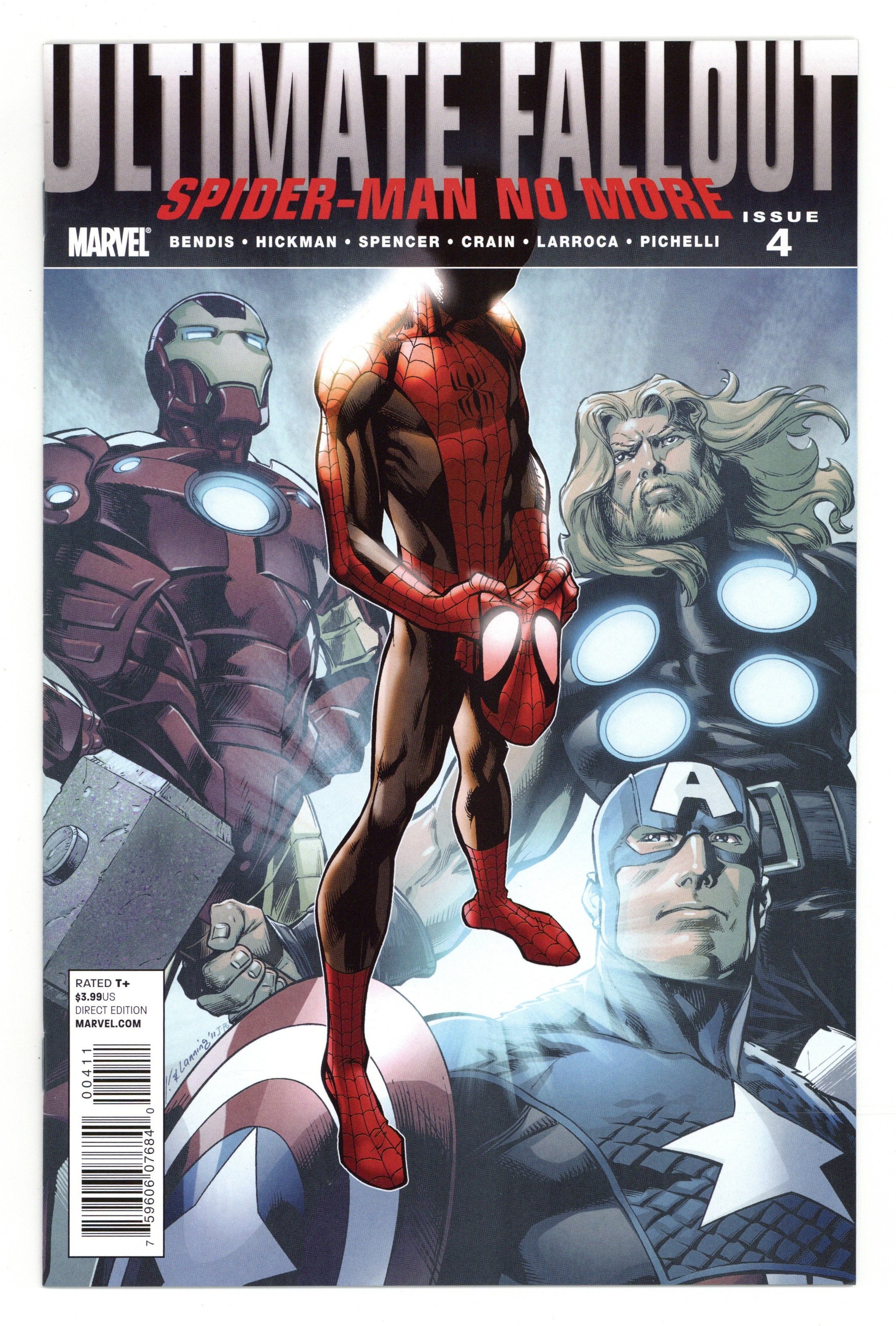 Starts Jan 3 Direct Edition. 1st appearance of Miles Morales. Written by BRIAN BENDIS, JONATHAN HICKMAN & NICK SPENCER. Art by SARA PICHELLI, SALVADOR LARROCA & CLAYTON CRAIN. Cover by MARK BAGLEY. What will become of Captain America? Where have all the X-Men gone? And what is up with the new Spider-Man suit? Don't miss the final chapters of one of the most talked about Ultimate events ever. 36 PGS. (each)/Rated T+...$3.99 (each) Cover price $3.99.