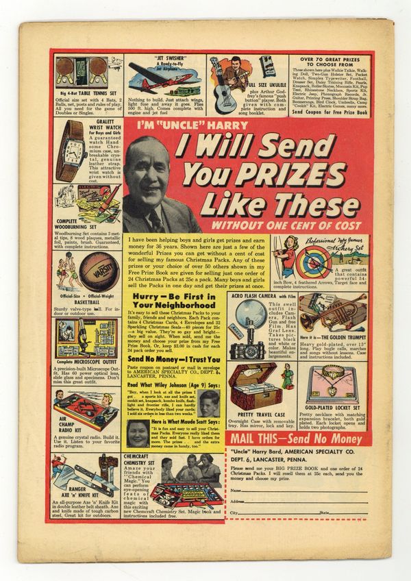Starts Apr 4 Cover art by Harry Anderson. Emily, art by Pete Tumlinson; An alien marries a homely Earth girl who is treated cruelly by those around her and gives her a ring that will protect her when the rest of his invasion force lands. The Search! text story. When a Vampire Dies; Villagers kill a vampire who was appointed for their district and he is replaced by a vampire not content to feed merely upon the blood of animals. The Man Who Meddled!; A researcher looking to accelerate the life span of mice succeeds, but because he was exposed to the process as well, his son is dead from old age two weeks after his birth, and he is aging rapidly too. Walking Horror, art by Tom Cooke. Oh, Baby!, art by John Forte. 36 pgs. $0.10. Cover price $0.10.
