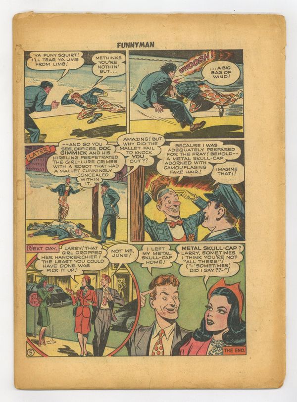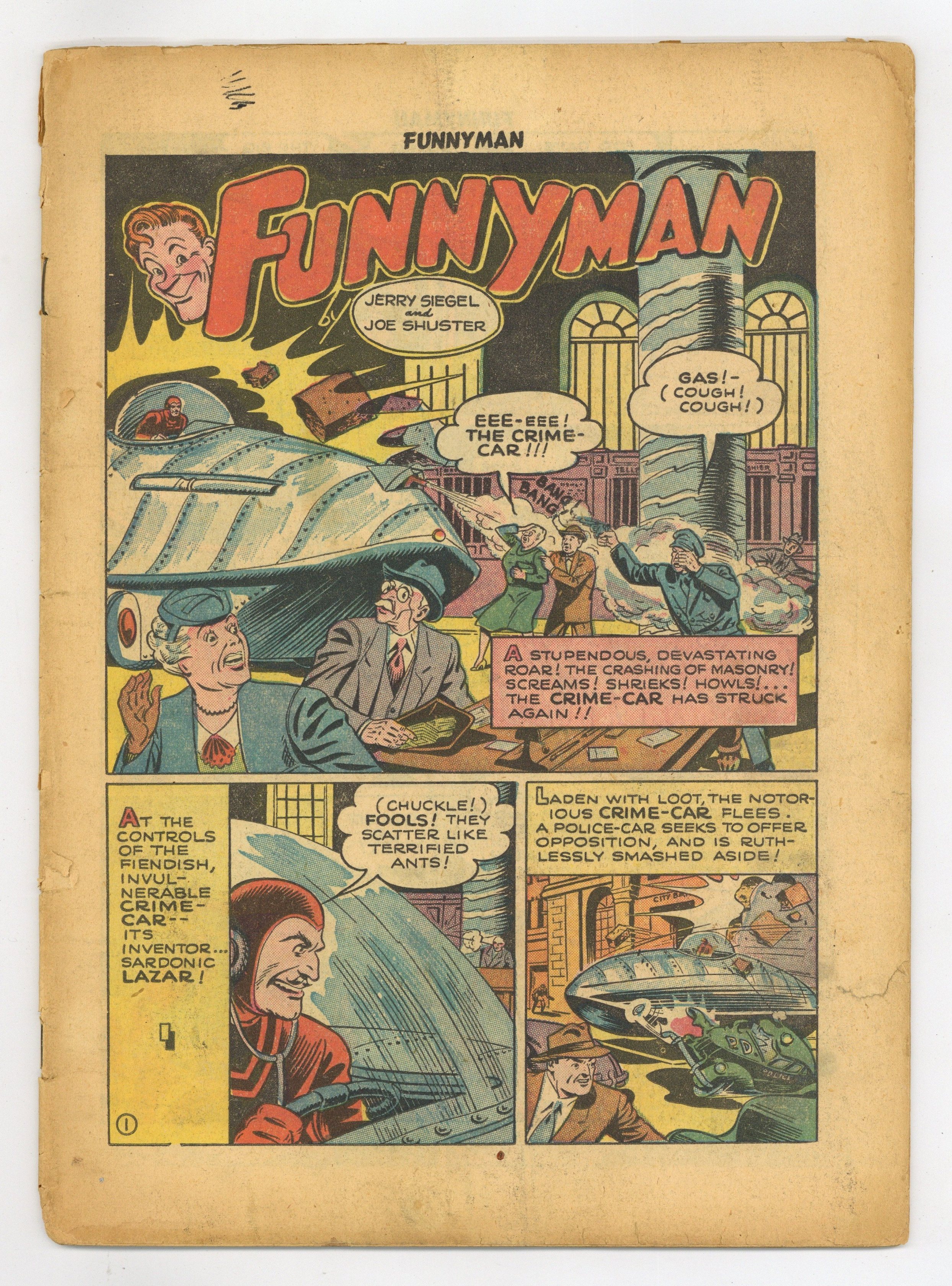 Starts Apr 4 Stories by Jerry Siegel, plus a text story by Ray Krank and Gardner Fox. Art by Joe Shuster, John Sikela and Dick Ayers. Cover by Creig Flessel. Famous as the "other" superhero created by Siegel and Shuster, who started the whole phenomenon with Superman. TV comedian Larry Davis uses vaudeville-style shenanigans to fight bad guys. When a mad scientist creates a bank-robbing car, Funnyman counters with his Jet-Jalopy; Jailbreak master Slippery Sam switches places with Funnyman, and only Larry's gal June guesses the truth; A mad scientist invents a robot woman who ambushes people, in a Looney Toons-style scenario. The Giant in the Doll House; Funnyman; A Fool's Duel; Slippery Slim; The Kute Knockout! 36 pages, Full Color. Cover price $0.10.