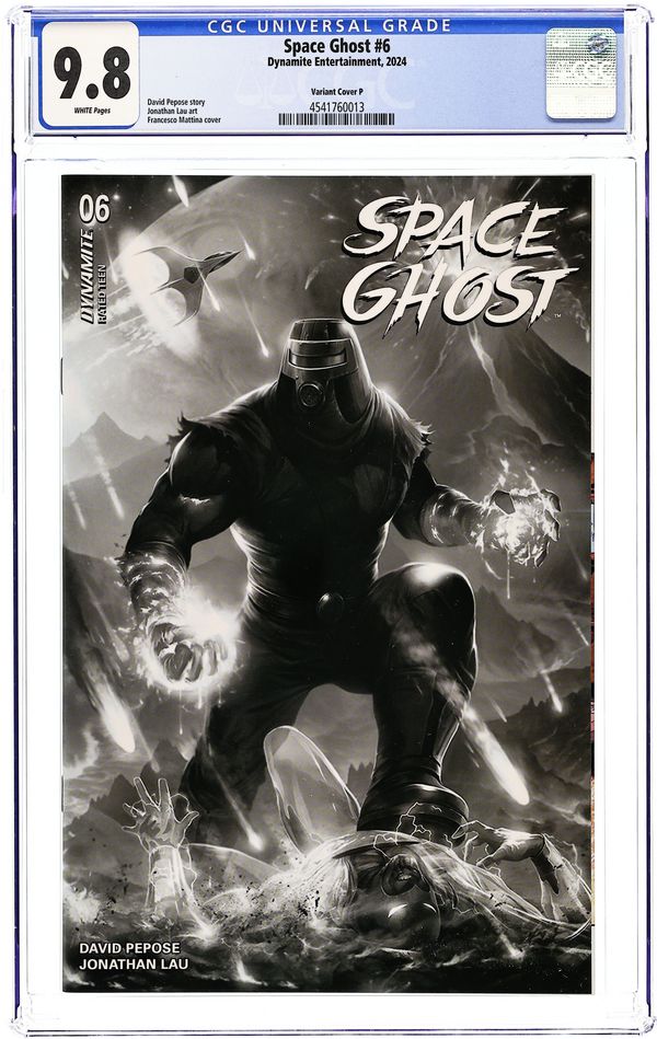 Published 2024 (est.) by Dynamite Entertainment.Space Ghost (2024 Dynamite) 6P CGC 9.8 Mattina B&W 1:7 Variant