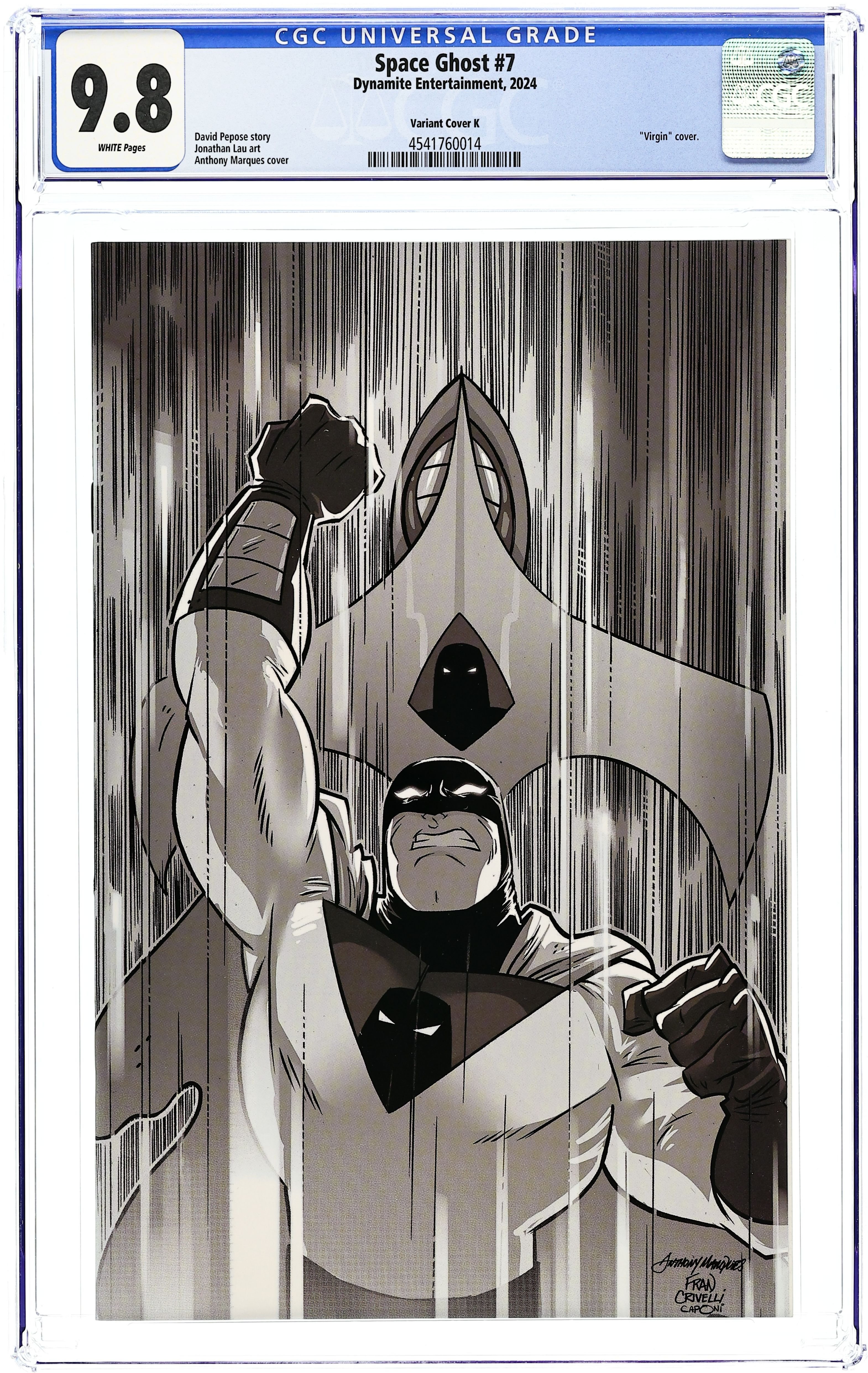 Published 2024 (est.) by Dynamite Entertainment.Space Ghost (2024 Dynamite) 7K CGC 9.8 Marques Virgin B&W 1:30 Variant